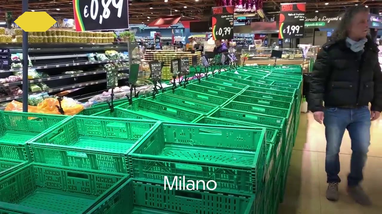 Residents of the small commune of Rozzano outside Milan lined up at grocery store. Driven by fears of the rapidly-spreading coronavirus, Italians in the Lombardy region have begun stockpiling food and basic necessities, leaving shops in a post-apocalyptic-looking state