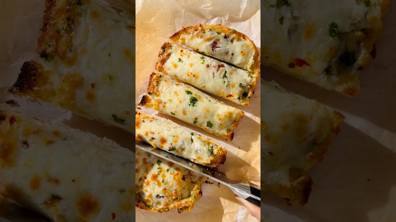 Prep the bread → Slice sourdough in half lengthwise and spread the garlic butter all over both halves. Top with Parmesan first, then finish with mozzarella.