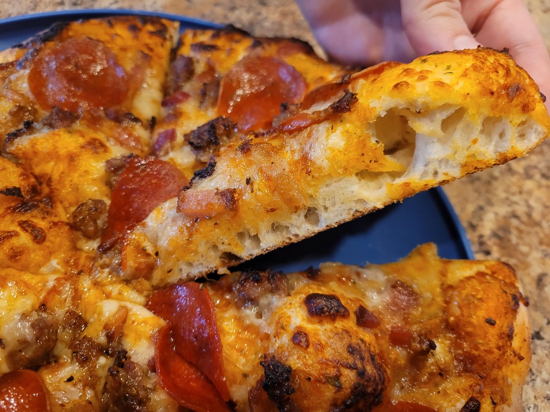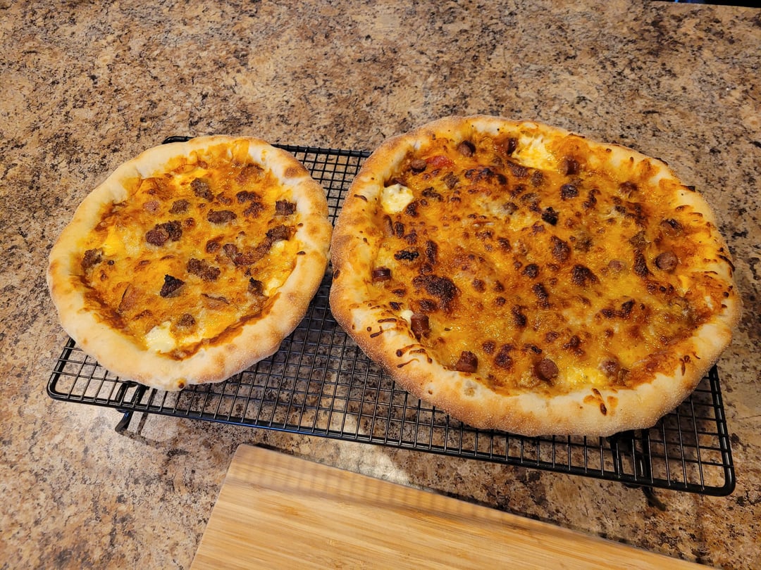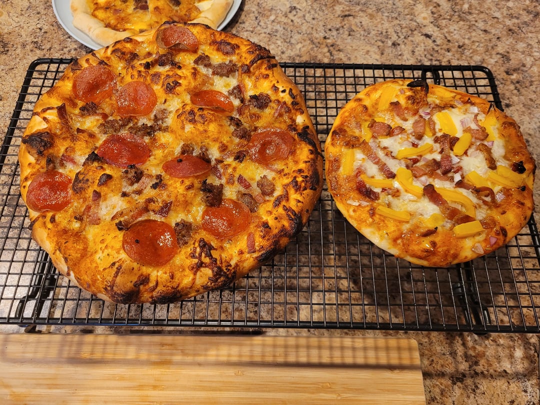 I experimented with thickness for me and Spouse. His pizza (Pic 2, left) was not fully stretched to get more fluffy, and the results (pic 3) speak for themselves! For me, I tried a pinched crust, and it made a great "bucket" for toppings that spread out nicely as it baked. Yellow pepper, shallot, sun dried tomato, and bacon for the toppings today, along with a garlic butter brush on the crust. I'm liking this combo!
