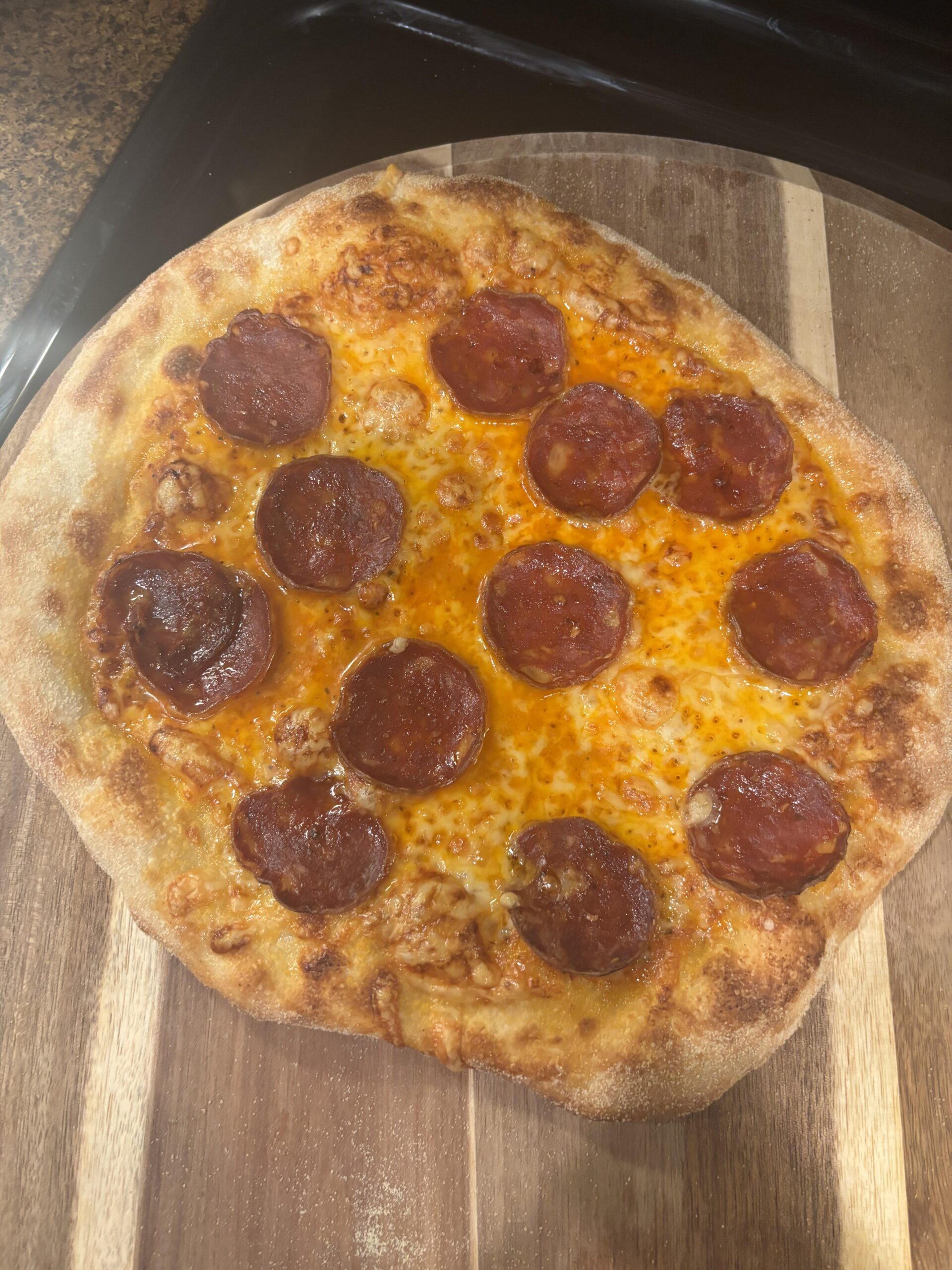 Used Scott’s Pizza Tours cold fermentation recipe for around 30 hours. Used marinara instead of regular tomato sauce because I didn’t know any better so came out quite greasy (+ soppressata) but very delicious.