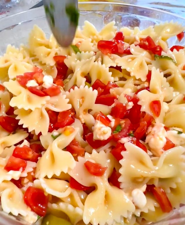 Put everything into your cooked Farfalle, add some salt and olive oil. And done.