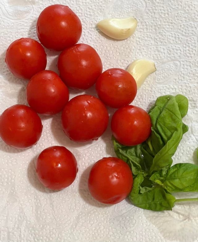 Just some cherry tomatoes, few basil leaves, some garlic, mozzarella cheese, and some olives.