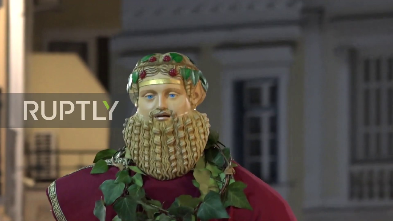 Masked participants dressed up in ancient Greek costumes and carried the man-sized phallic figurine through the streets of Plaka, Athens old city district, singing songs and dancing.