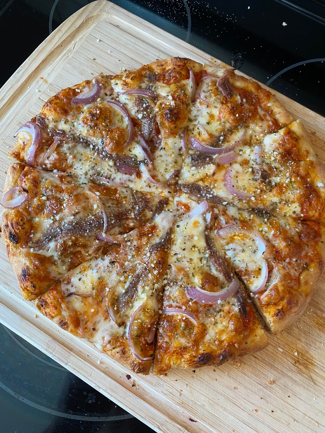 A sautéed Sausage, onion and spinach with Cheddar and Pecorino, A Kalamata Olives and Mozzarella and pecorino Romano, cheese, and also an Anchovies and red onions, With Mozz, Pecorino and Monterey Pepper Jack.