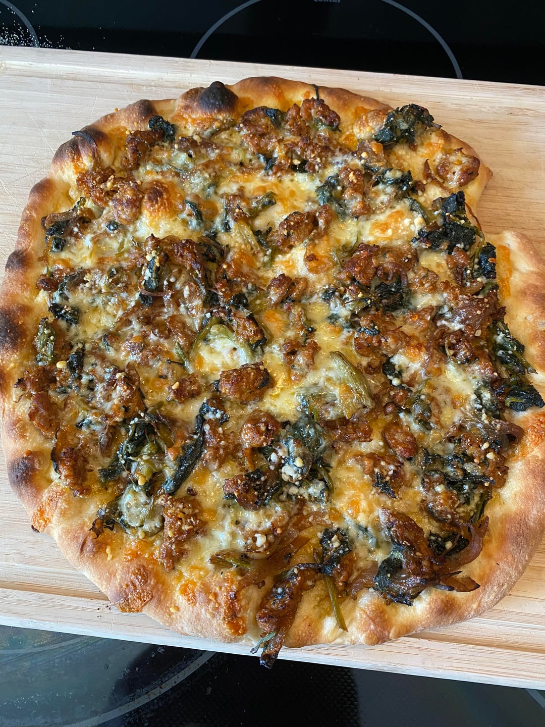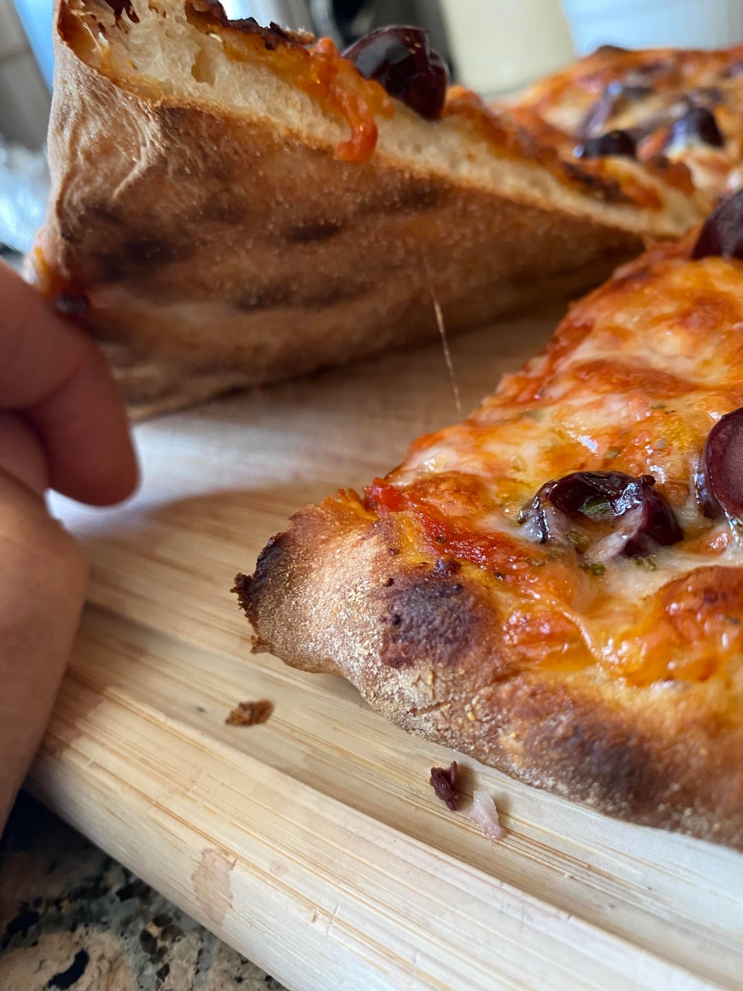 A sautéed Sausage, onion and spinach with Cheddar and Pecorino, A Kalamata Olives and Mozzarella and pecorino Romano, cheese, and also an Anchovies and red onions, With Mozz, Pecorino and Monterey Pepper Jack. 48 hrs KA Biga and Caputo 00 flour. Nice chewy and tasty results with the Biga, usually I use a sourdough starter but might stick with this method for a while.