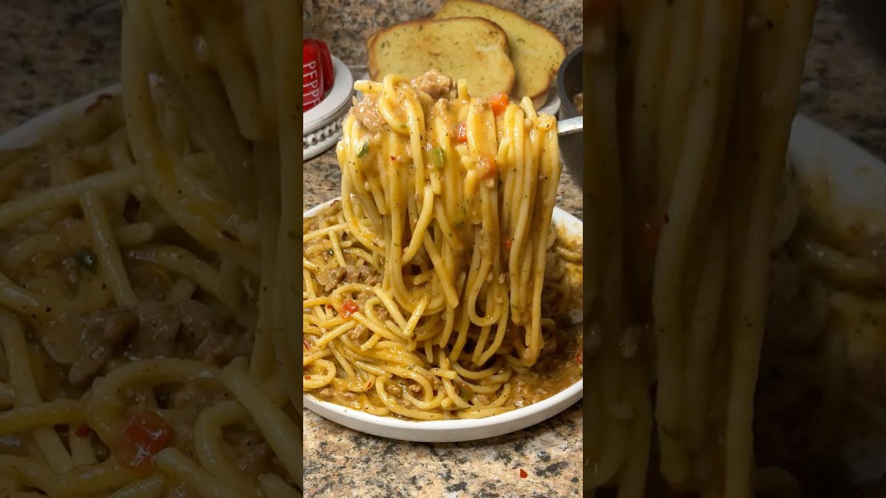 Boil 12 oz of spaghetti until al dente, being sure to reserve 1-2 cups of the pasta water. While that’s cooking, brown 1 lb of ground beef with 1/2 cup of each: red bell pepper, green bell pepper, and a yellow onion. Season with about 1/2 tsp of each: Morton Nature Seasoning, Slap Ya Mama, Italian seasoning and a pinch of cayenne if you like it spicy. Stir in 1 tbsp of tomato paste and cook it down for a couple minutes. Then stir in 6-7 minced garlic cloves and cook another minute. Now stir in 1/4 cup of all purpose flour and let it cook for 3-4 minutes to cook out the raw flour taste. Slowly stir in 3 cups of beef broth. Stir over low heat and let it simmer until it thickens up. Drain the spaghetti and mix it in with the sauce along with 1 cup of the pasta water. Stir until it’s your preferred consistency. You may need to add a bit more pasta water. Season to taste if needed. Serve hot and enjoy!