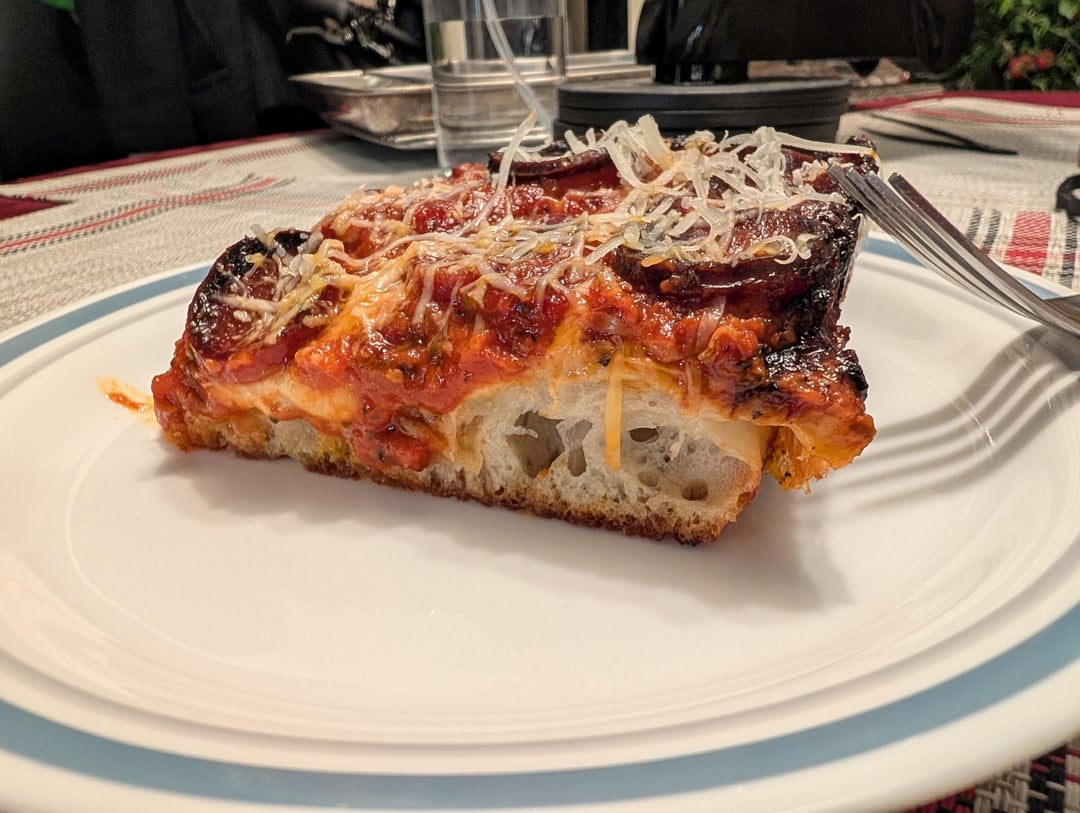 I'm pretty happy with my first attempt. Crust tasted amazing with a good chew. I'd have liked the cheese to be a bit crisper but likely need to source some Wisconsin brick cheese some how instead of the low moisture while milk mozzarella and kerrigold dubliner blend with a sprinkle of romano at the end that I used. Crust took inspiration from Serious Eats and King Arthur at 73% hydration and two days in the fridge.