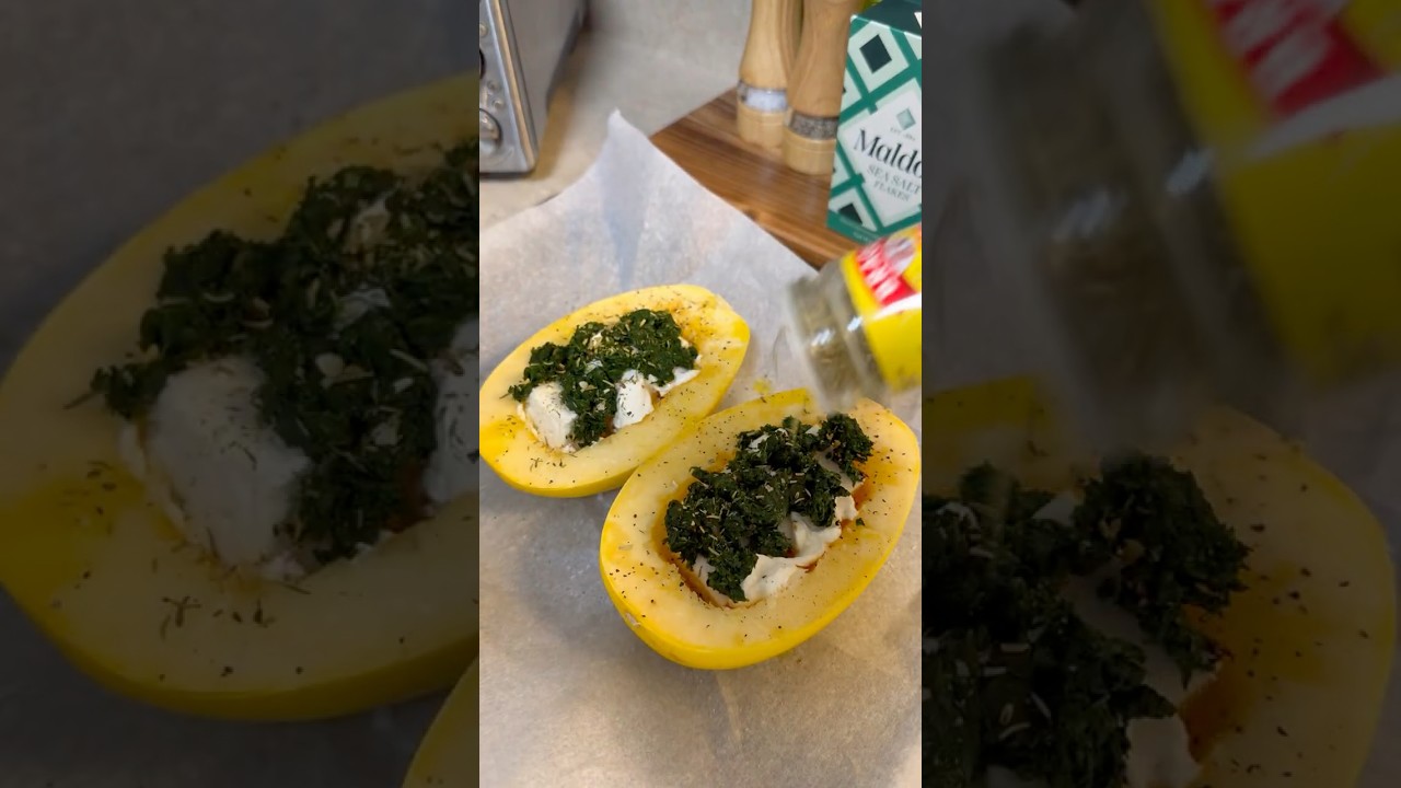 – Top with seasoning then bake in the oven for at least 45 mins or until the squash is easily shredded