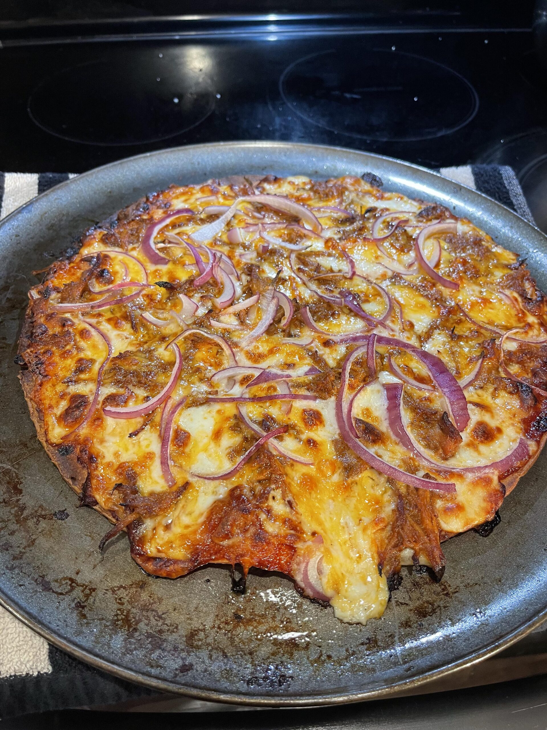 Thin crust BBQ pizza I made with leftover bbq rib meat, mozzarella, cheddar, and red onions. It was crispy and so delicious! The thin layer of bbq sauce on the crust really helped with the over all flavor. Baked at 425 for 8min and then under the broiler for 2min to finish it off.
