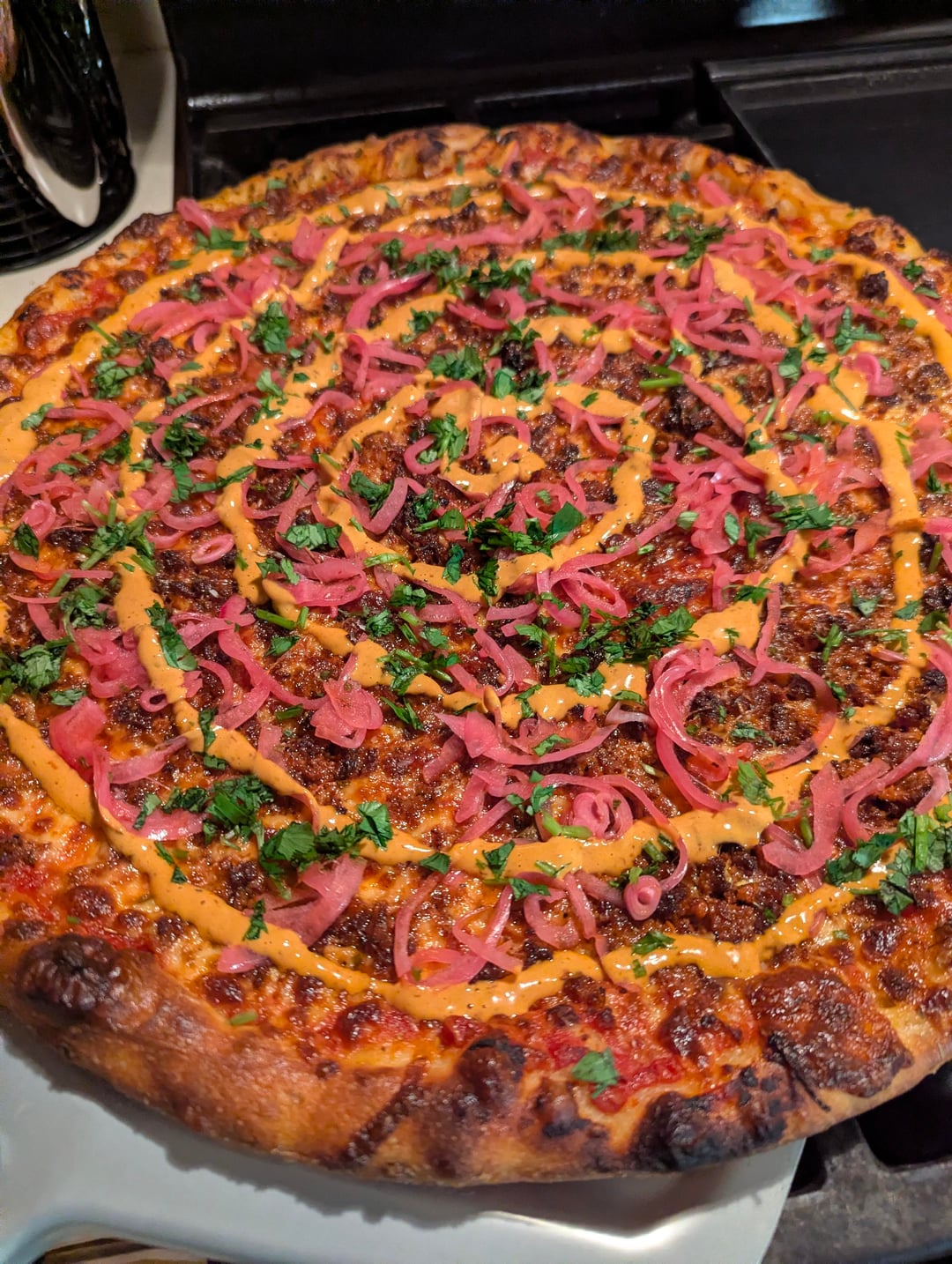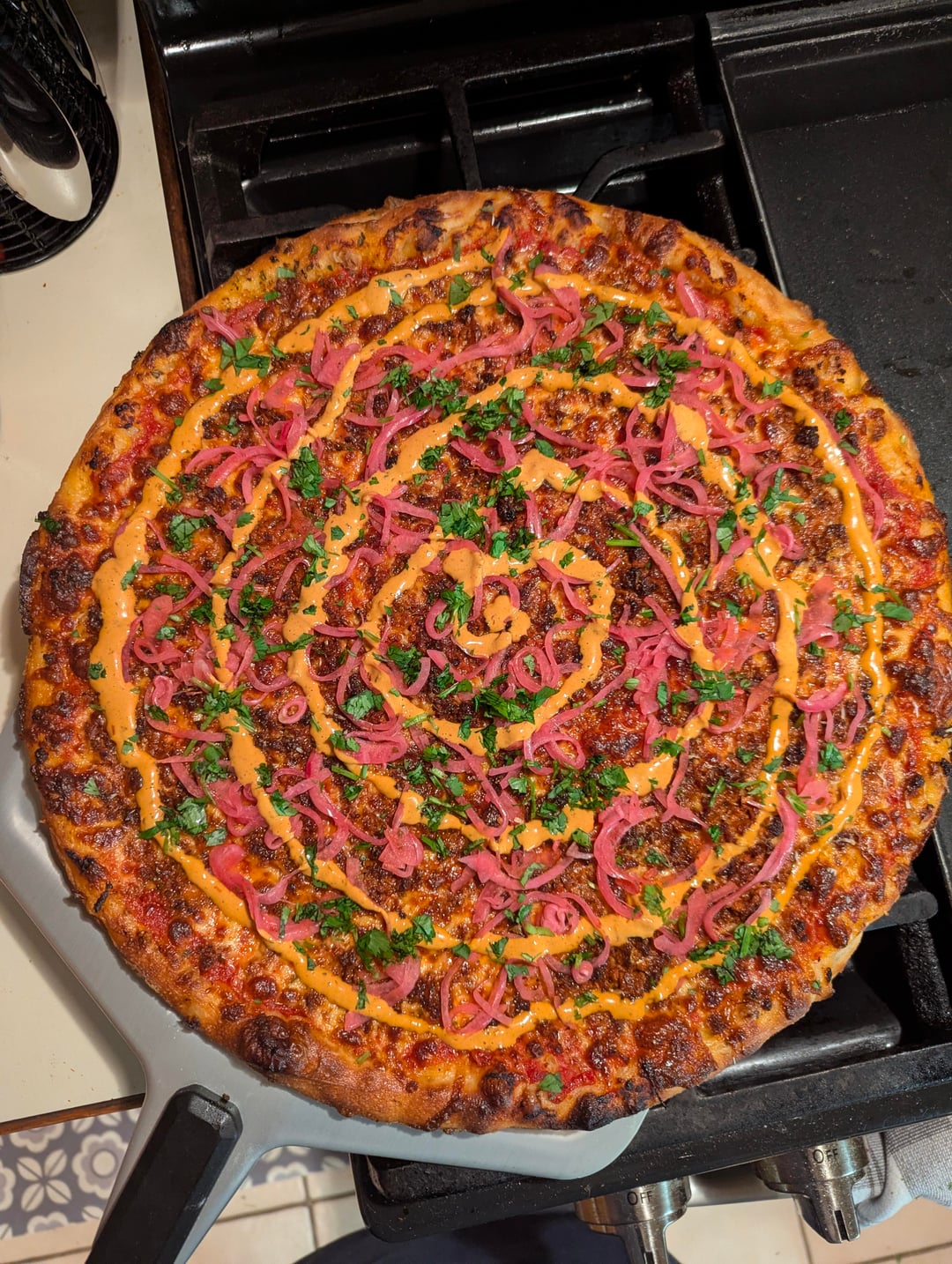 This topping combo has become a favorite in my house: chorizo, pickled onions, chipotle sauce swirl, and cilantro.