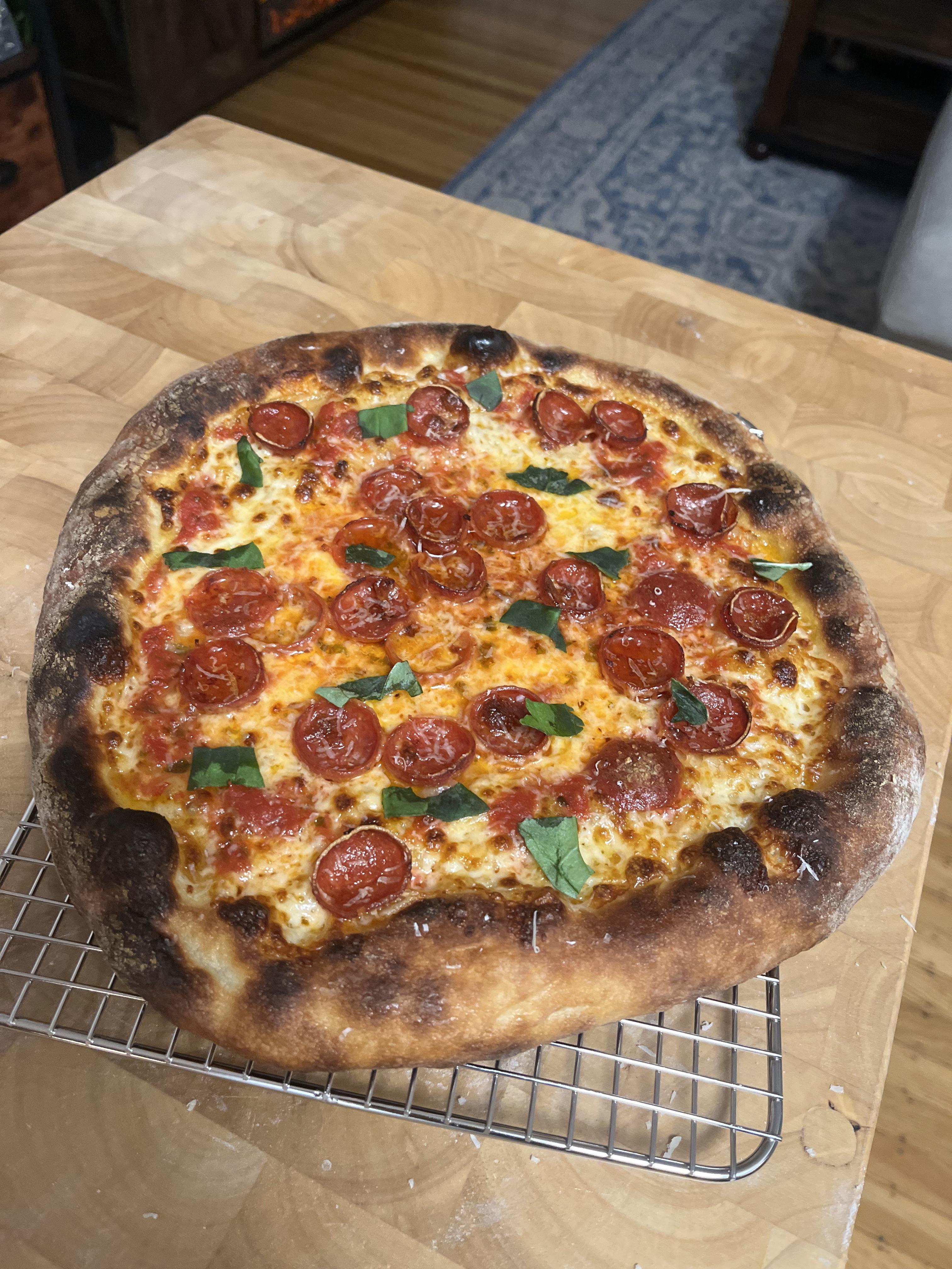 550*F on a steel for 7 minutes. Broiled in the broiler drawer for a minute or so. Cup n char peps, trader joes low moisture full fat mozz, parmesan, hydroponic basil. Put some olive oil on crust just before the broil. Nice and crispy (forgot to take a pic of the bottom before I ate it all).