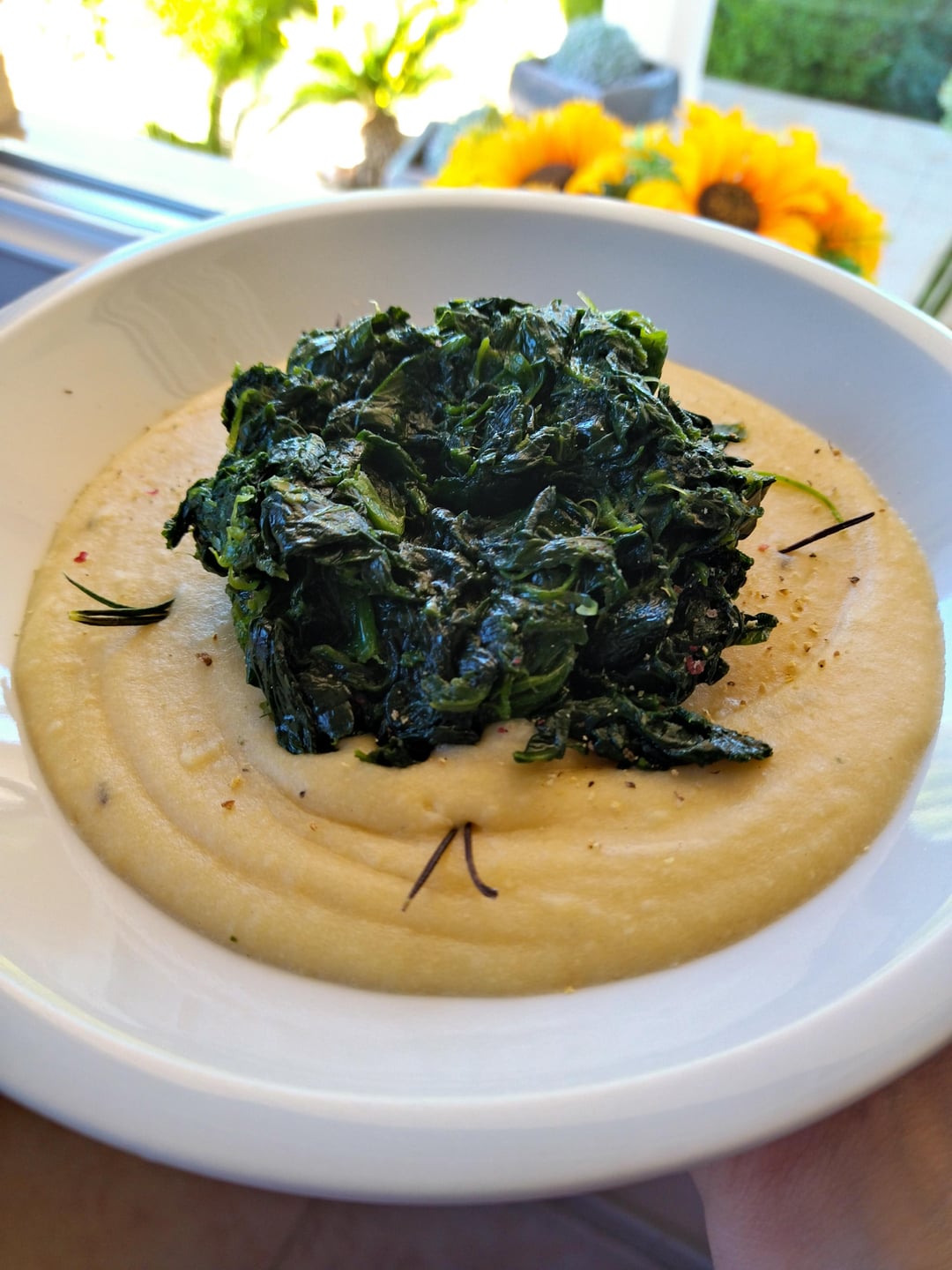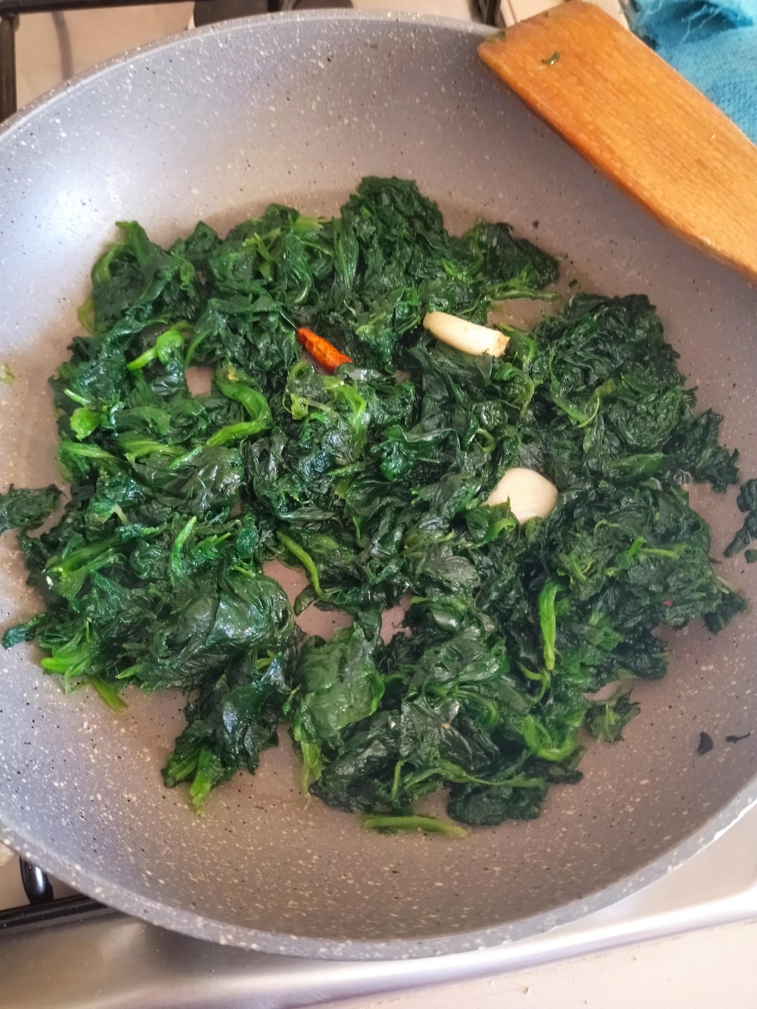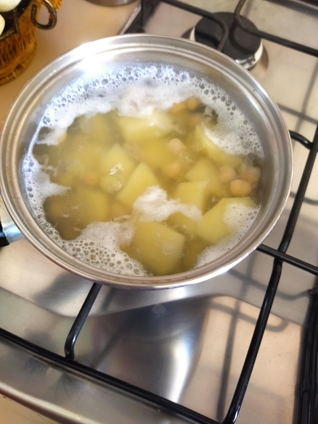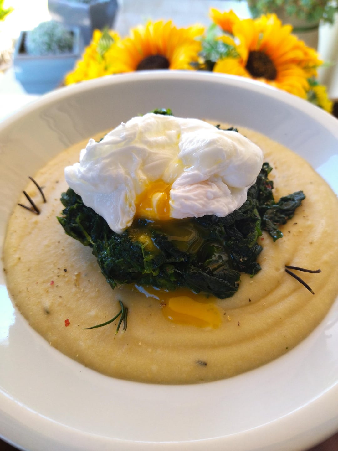 Ho fatto bollire 3 patate piccole e qualche manciata di ceci in scatola (meno della metà), poi ho frullato tutto e aggiunto sale, olio, noce moscata, qualche rametto di rosmarino e mix di pepe. Nel frattempo ho saltato in padella con olio, aglio e peperoncino degli spinaci, messi poi sopra la crema di patate e ceci e aggiunto un uovo in camicia un po’ sfigatello.. non mi viene mai in grazia di Dio.🥲