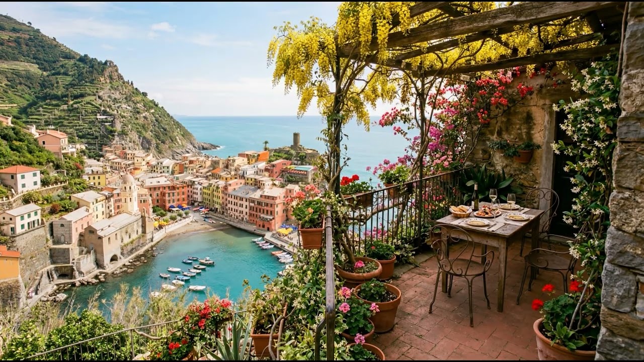 Peaceful, traditional style, ocean view, veranda, Italian villa, wine, morning, spring, scenery, stress relief, calming, comforting, inspiring, music scene, ambient music.