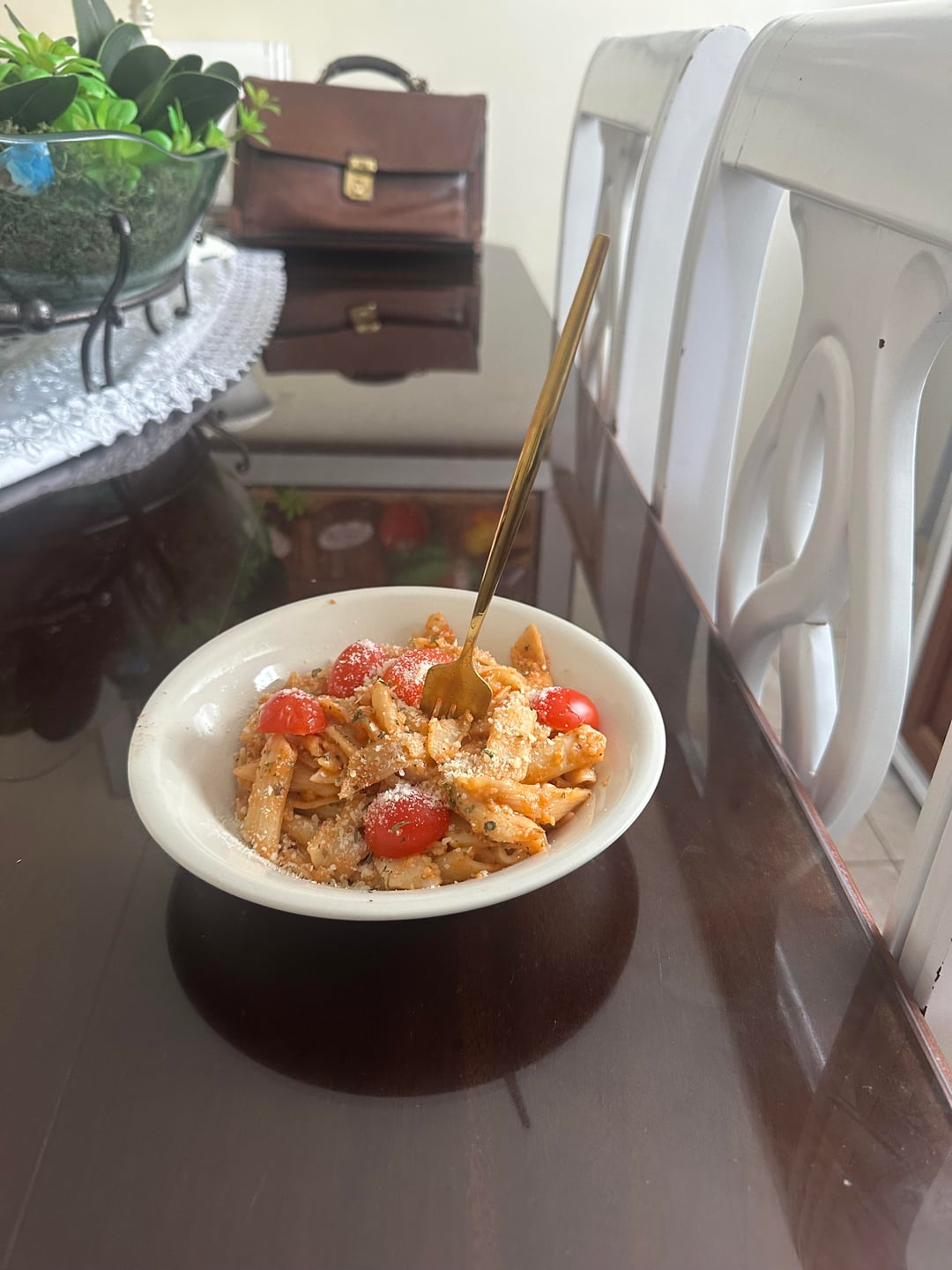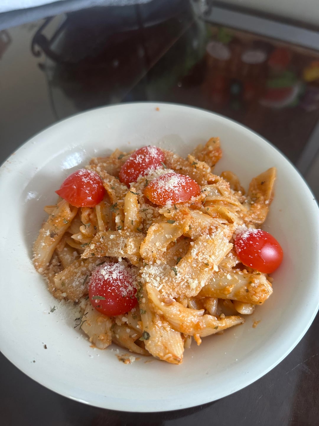 Penne Ziti Rigatti with Prego Pizza Sauce; topped with parsley from Badia, Grated Parmesan cheese from crystal farms and cherry tomatoes. Hope u enjoy!