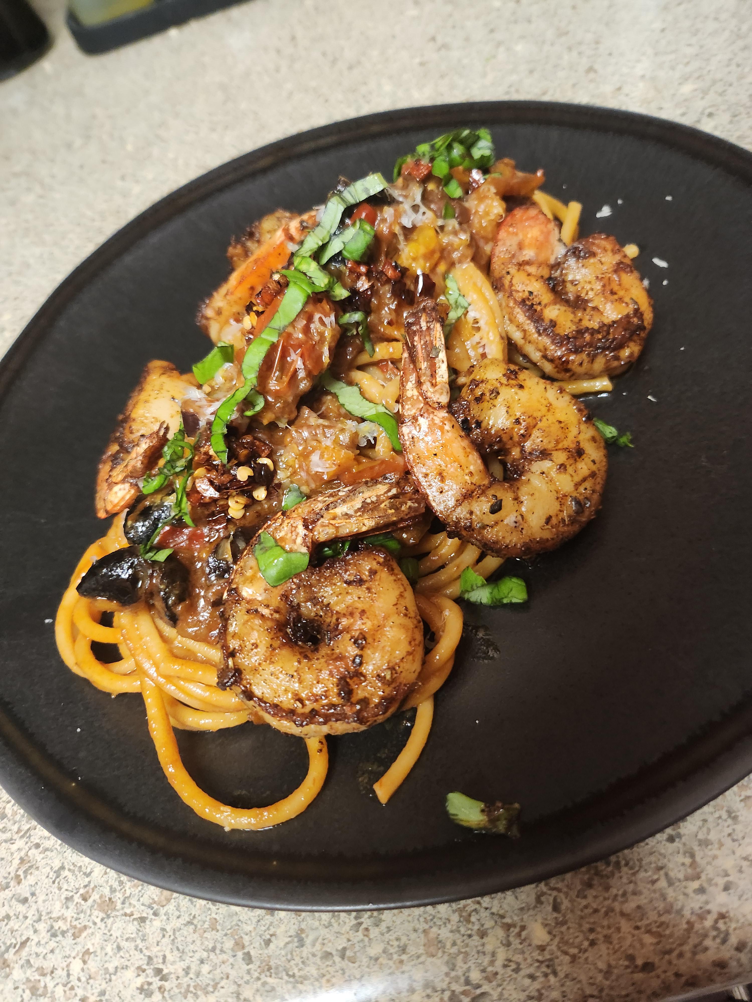 Shrimp is just shrimp but I did a pseudo blackening with garlic, paprika, Oregano, black pepper and, celery salt.
