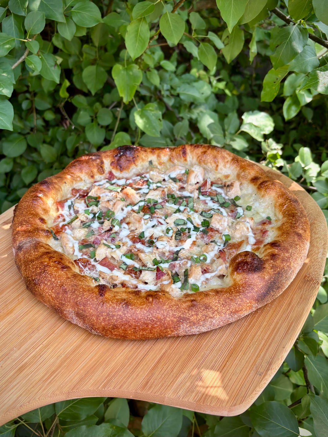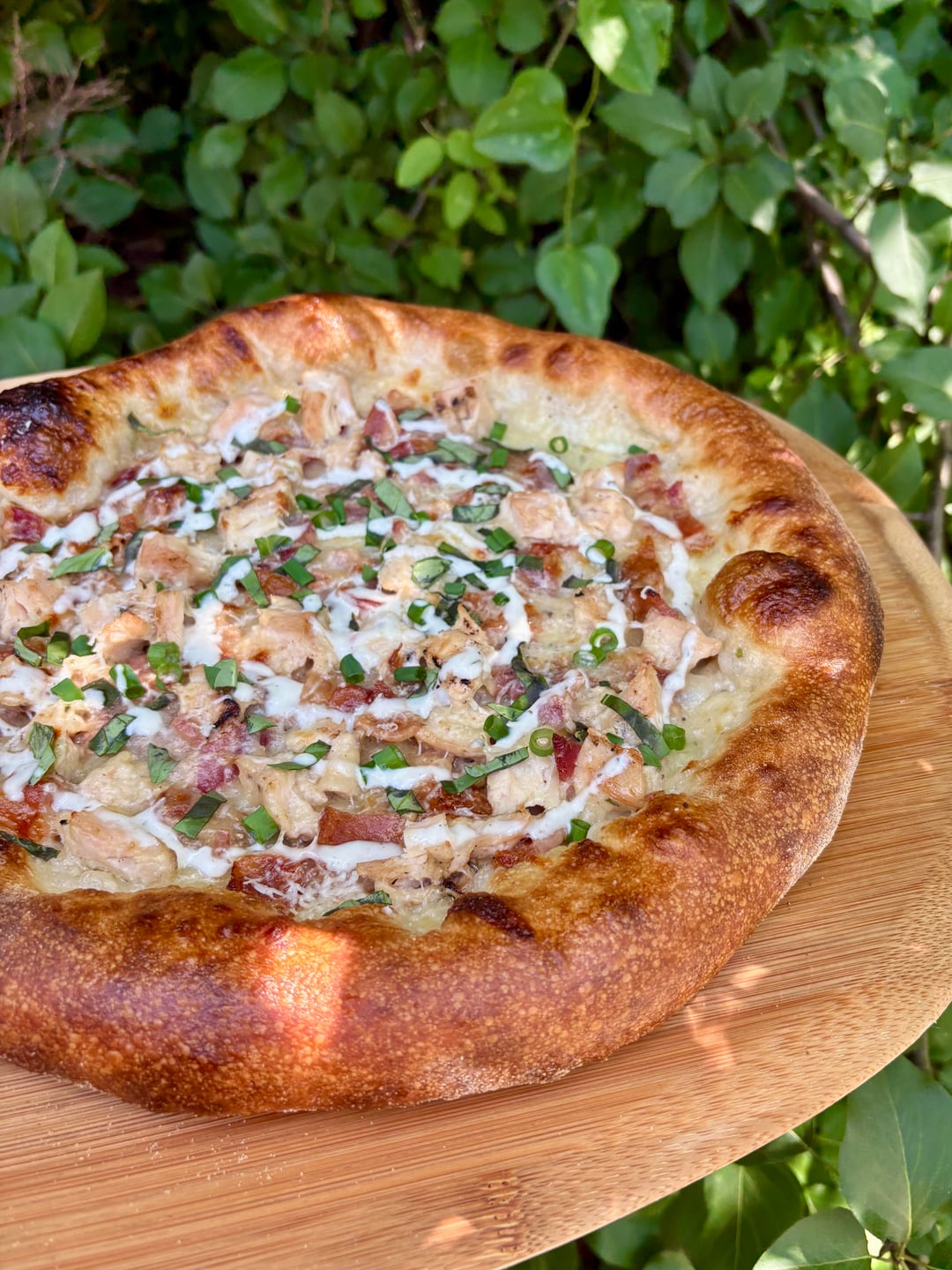 Quick chicken bacon ranch for lunch today. Ranch base, mozzarella, bacon, grilled chicken. Finished with pecorino romano, green onions and basil, and drizzled with more ranch.