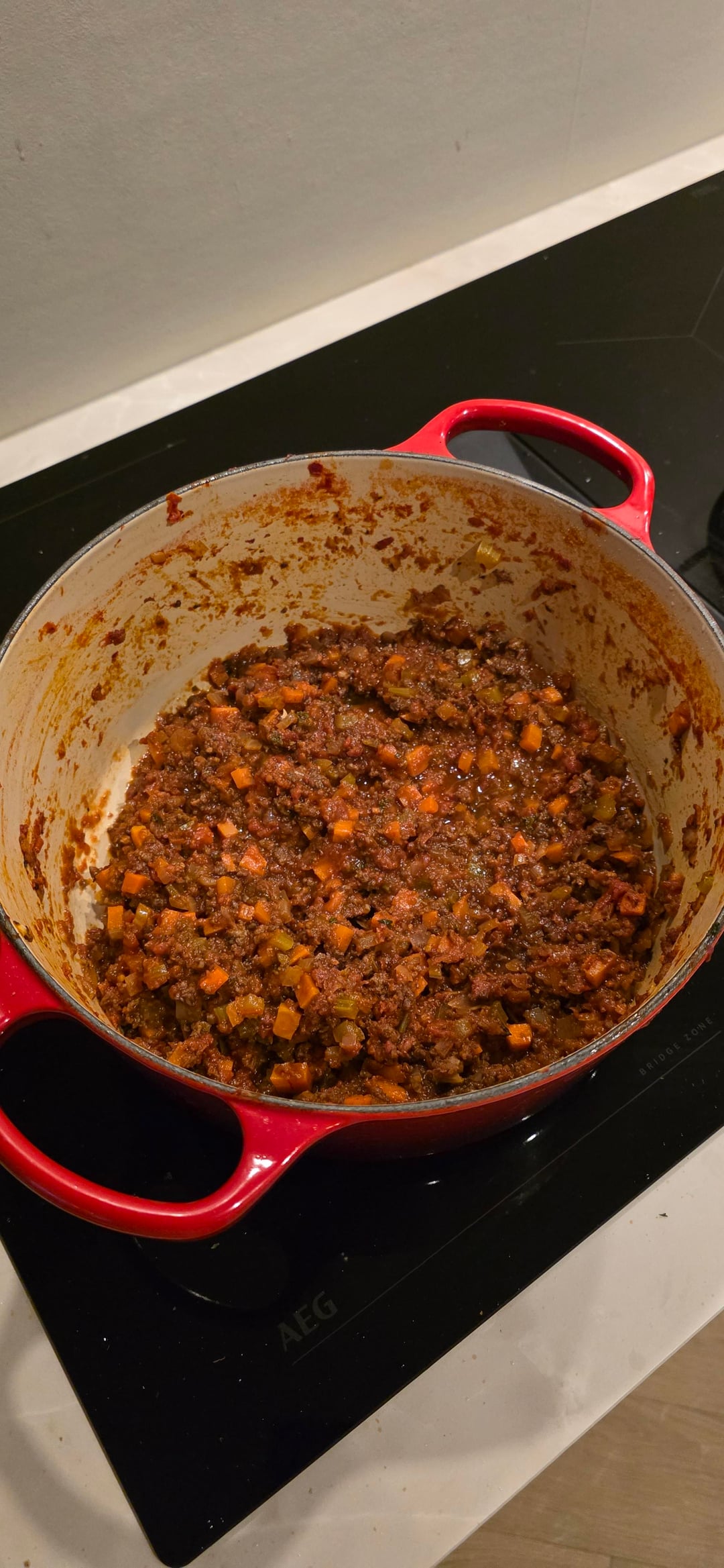 I then removed the sauce, browned the ground beef with the soffritto, and deglazed the pan with red wine. After that, I added the tomato sauce back in and let everything simmer for another 50 minutes to cook off the wine and let the herbs infuse.