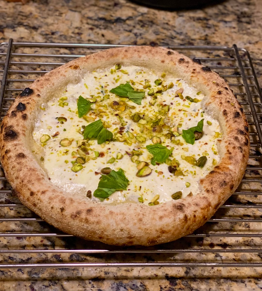 Had a bunch of filling left from yesterday’s ravioli (Ricotta, mozzarella, basil, parmigiano, s&p). Thinned it slightly and used it as the base, then topped with chopped pistachios post-bake.
