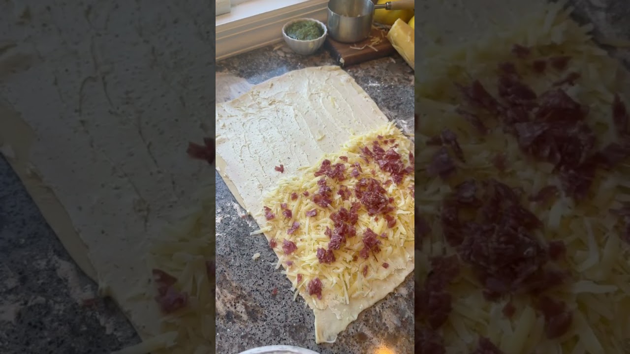In a small bowl mix the cream cheese and pesto. Spread the mixture all over the top of the entire piece of puff pastry.