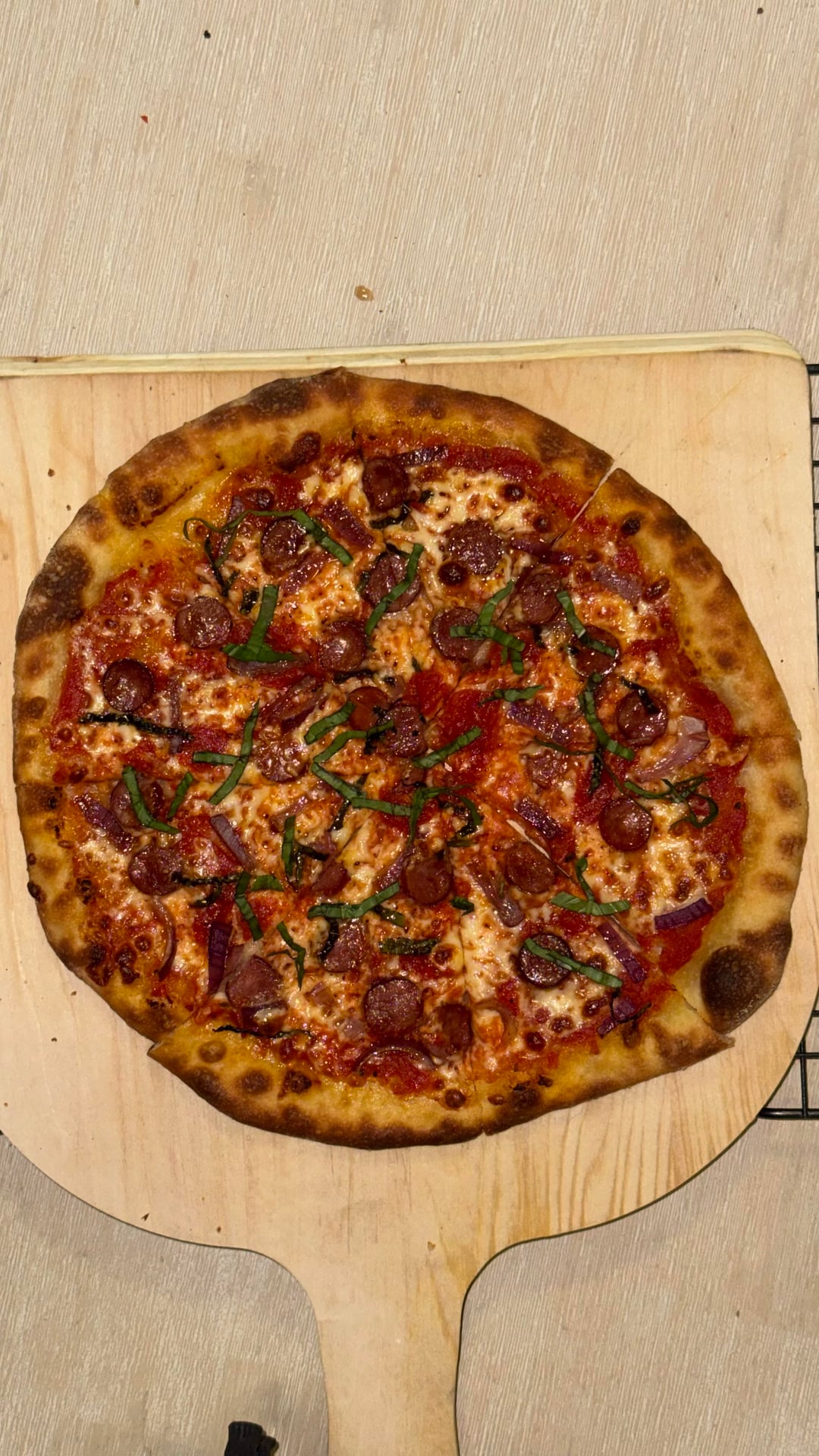 The cheese was part skim low moisture from costco. The sauce was crushed tomatoes with tomato paste, salt, pepper, basil, and grated Parmesan. The sausage was Croatian pepperoni.