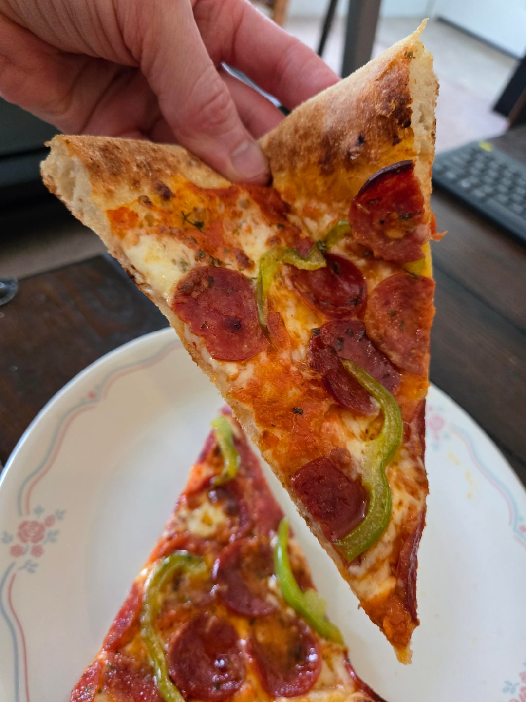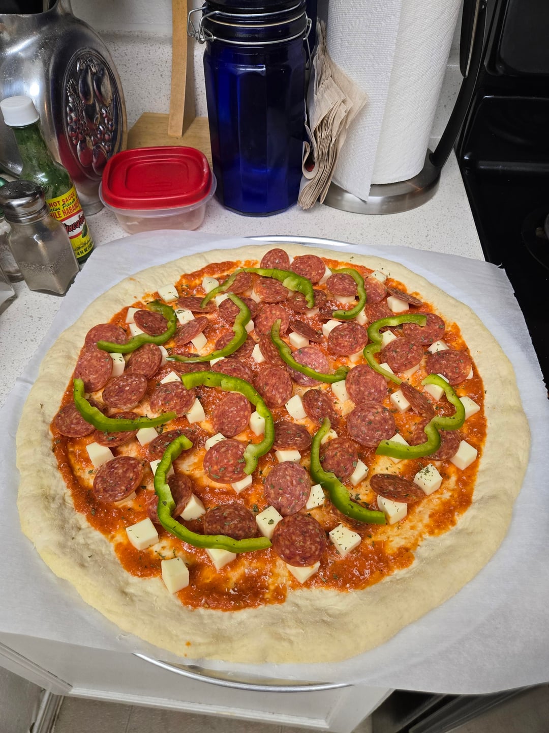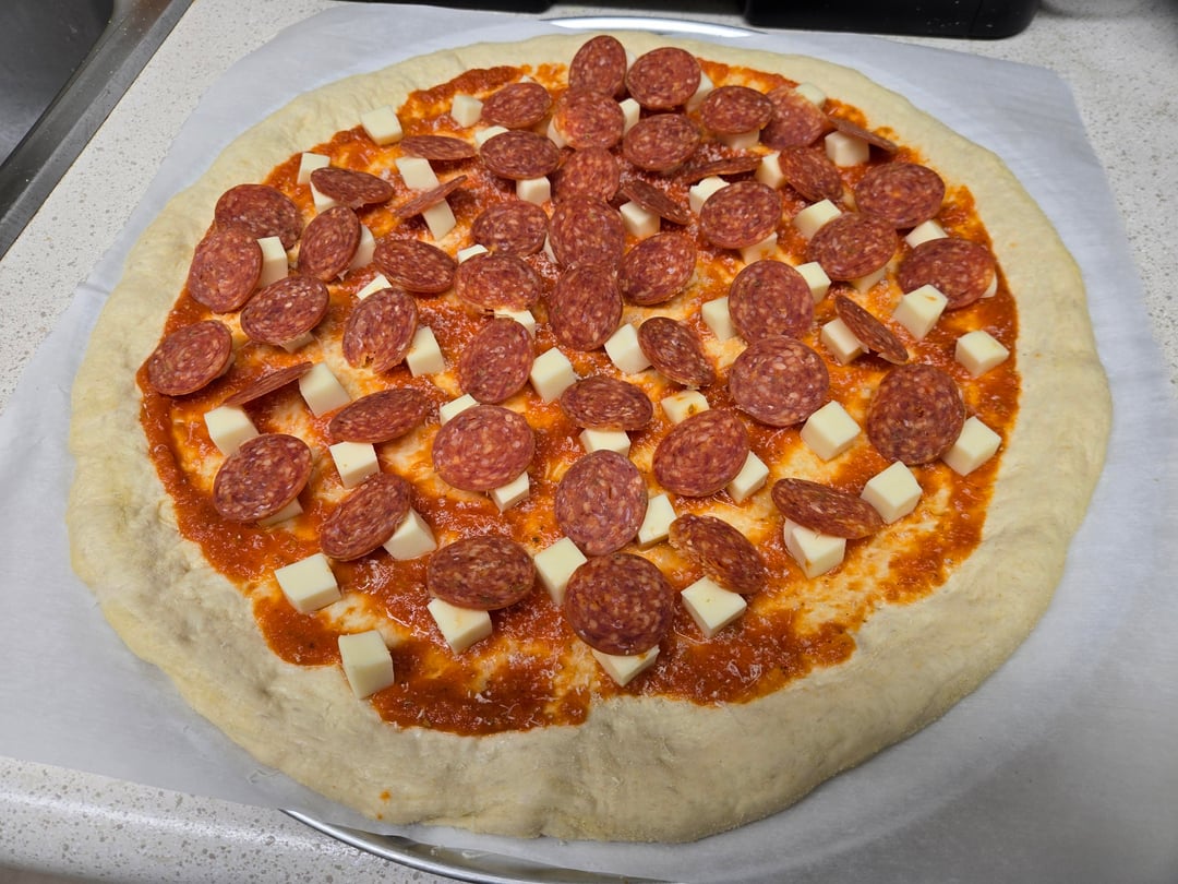 Hand-sliced pepperoni, green (bell) pepper, (my own) tomato sauce, fresh grated Parmesan and cubed mozzarella!
