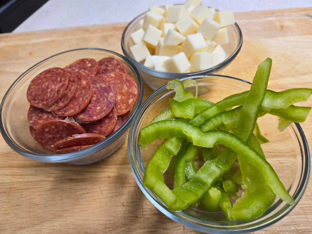 I'm just joking around about the smashing. I decided on something simple this week. Pepperoni and green pepper. I decided to have pieces of green pepper this time, as opposed to chopping, dicing, rings. What's your favorite way to prep green pepper?