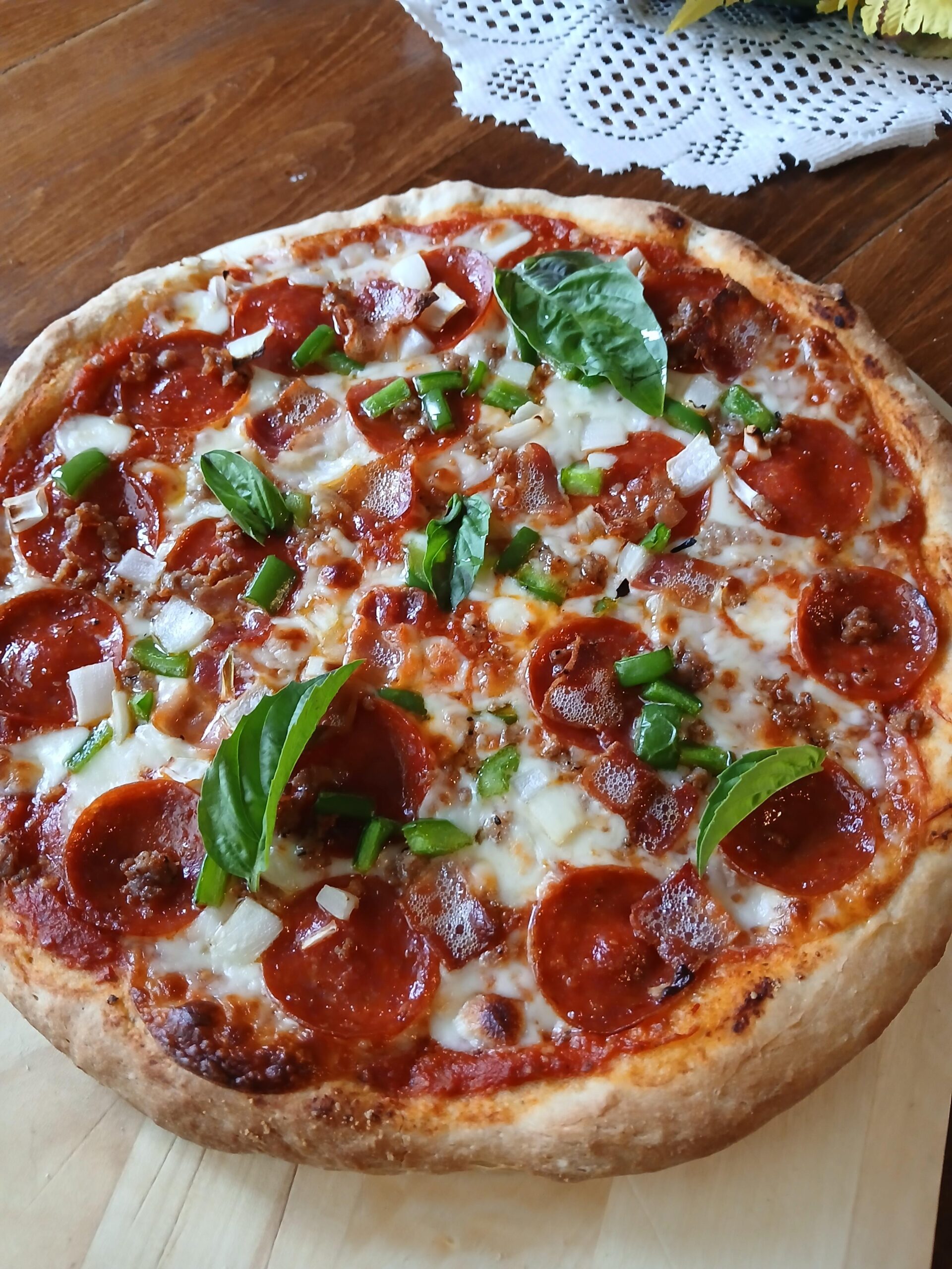 Homemade pizza 🍕 with provolone and wet mozzarella, topped with pepperoni, bacon sausage, green pepper, onion. Once out of the oven, basil leaves and drizzled with EVOO. 550° oven 8 minutes.