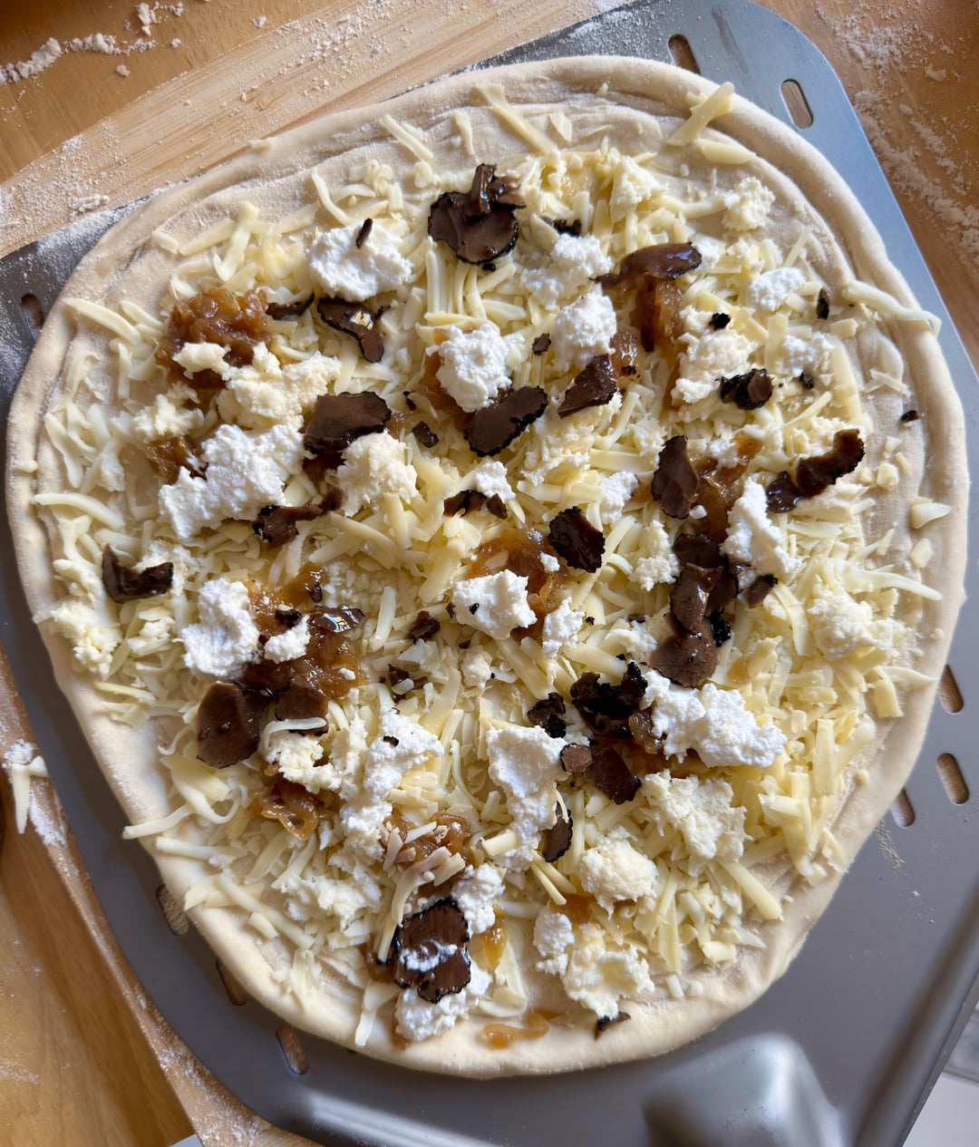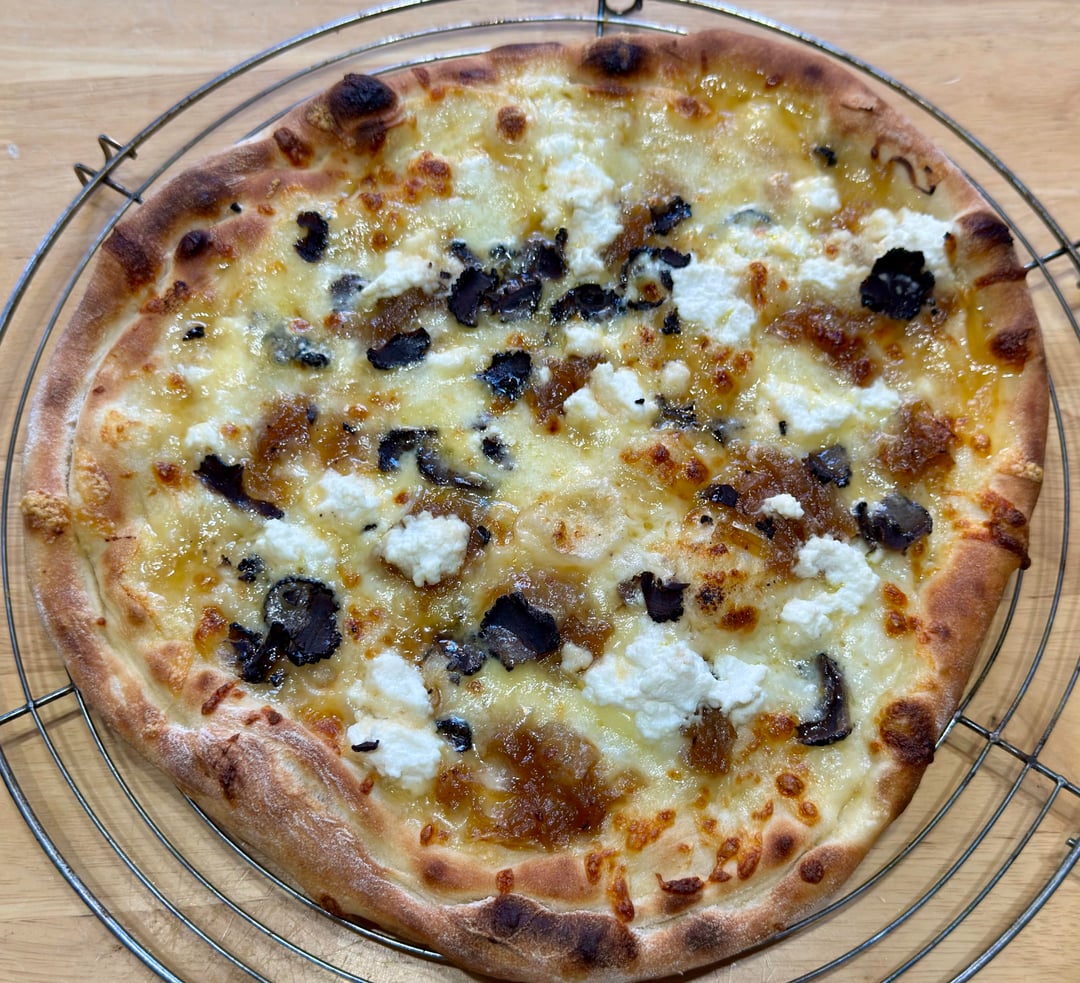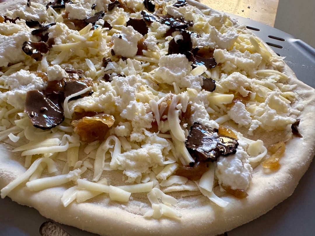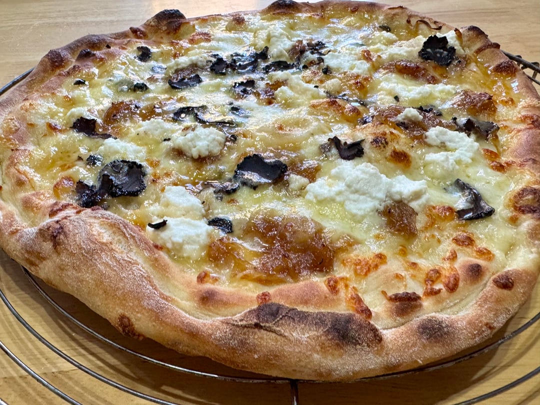 Fancied something different so banged out a white pizza , cheddar , mozzarella , ricotta , fresh mozzarella, caramelised onion dotted around the base along with puréed garlic 🧄 it was divine , lil pockets of caramelised onion with hits of garlic and truffle