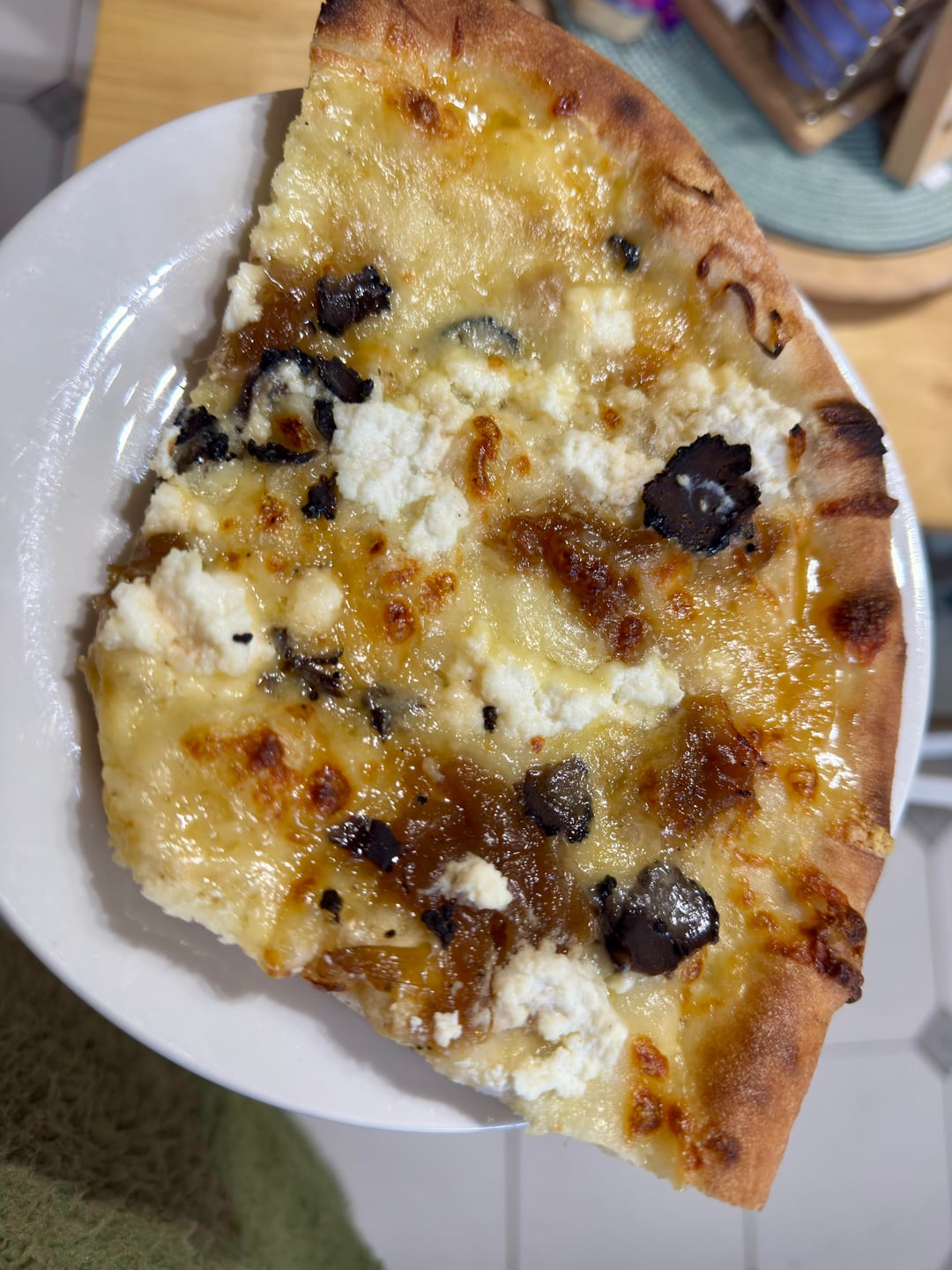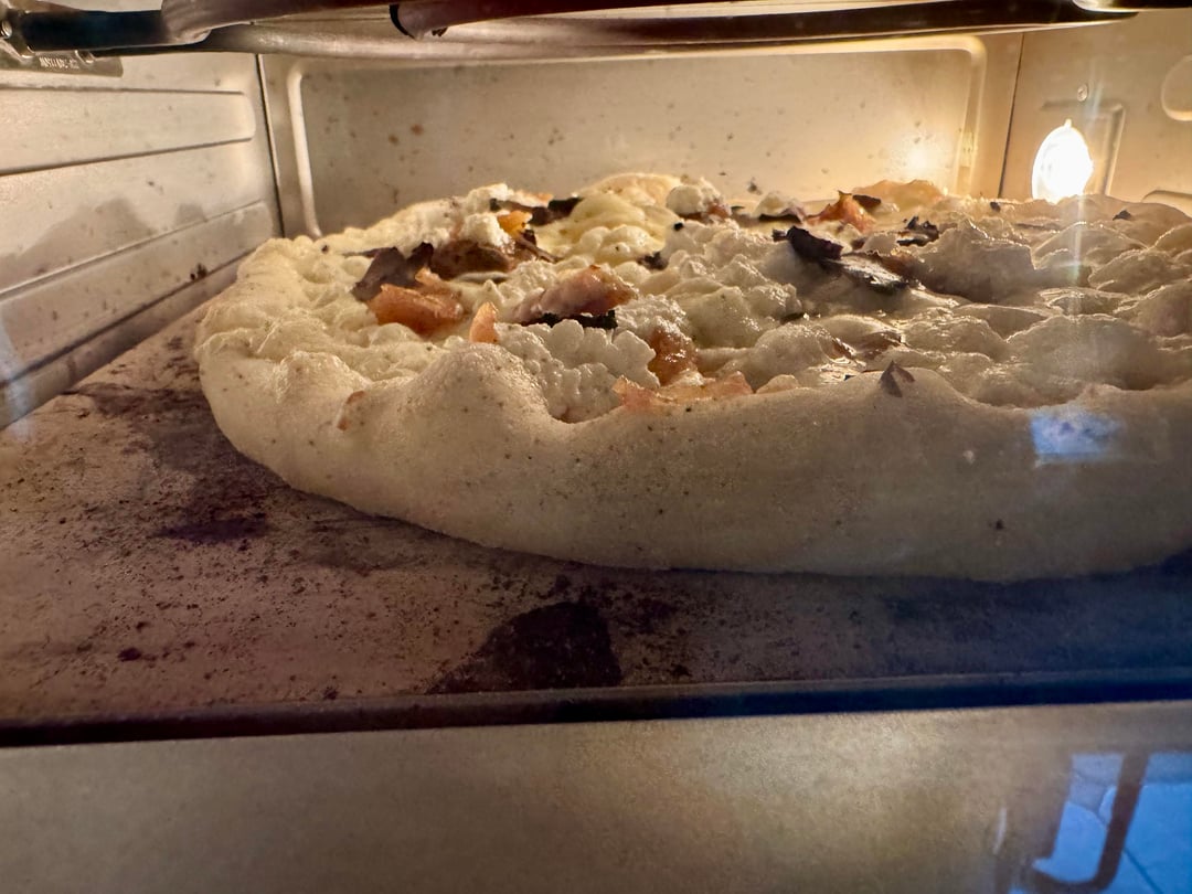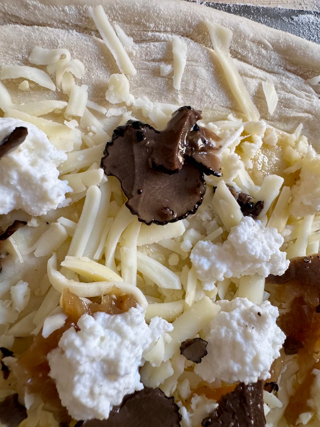 Fancied something different so banged out a white pizza , cheddar , mozzarella , ricotta , fresh mozzarella, caramelised onion dotted around the base along with puréed garlic 🧄 it was divine , lil pockets of caramelised onion with hits of garlic and truffle