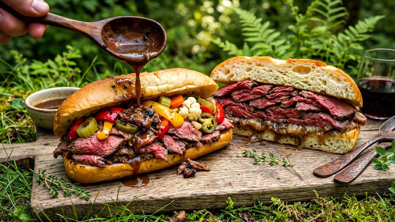 After trekking deep into a secluded wilderness, a rustic fire pit is carefully assembled from natural stones, and a heavy cast-iron skillet is set over glowing embers. A thick cut of beef is expertly trimmed, generously seasoned with coarse salt, then seared until a rich crust forms. It’s slowly braised in a fragrant garlic-butter broth, becoming melt-in-your-mouth tender and easy to slice. Fresh jalapeños are charred over open flames, releasing a smoky aroma, while crusty bread is prepared nearby. The final sandwich comes together in true rustic style — dipped generously into the hot, savory juices until it’s dripping, rich, and irresistibly messy.