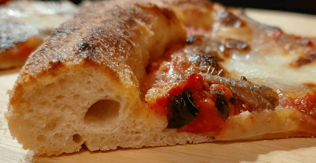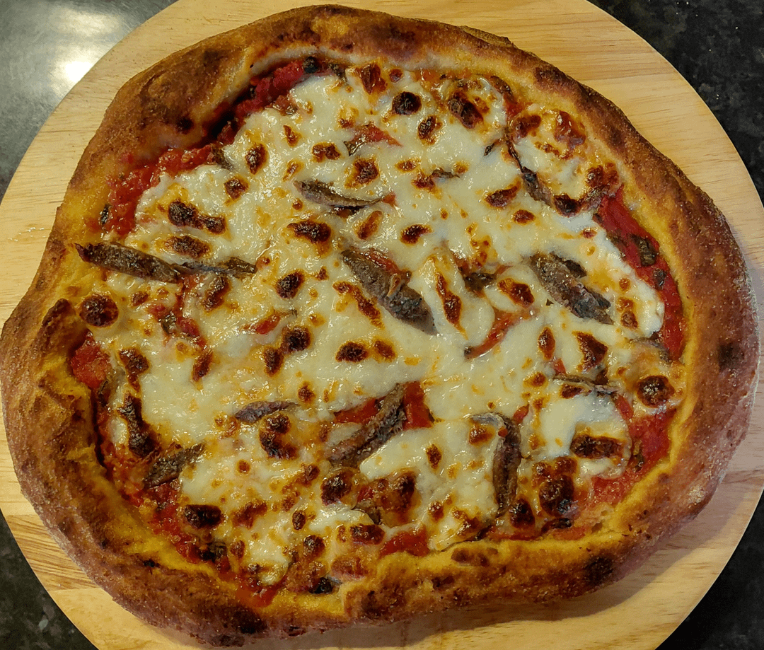 60% hydration 24 cold ferment 0.9g IDY, mozzarella, tinned tomatoes, oregano, fresh basil, anchovies. Came out quite bready in the crust, but it browned nicely with some olive oil brushed on there. The underside was pale as usual but I feel like for the equipment I've got I'm learning a little more each time.