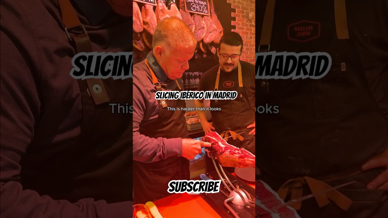 Learning how to slice Ibérico ham in Madrid at Mercado Jamón Iberico— harder than it looks.