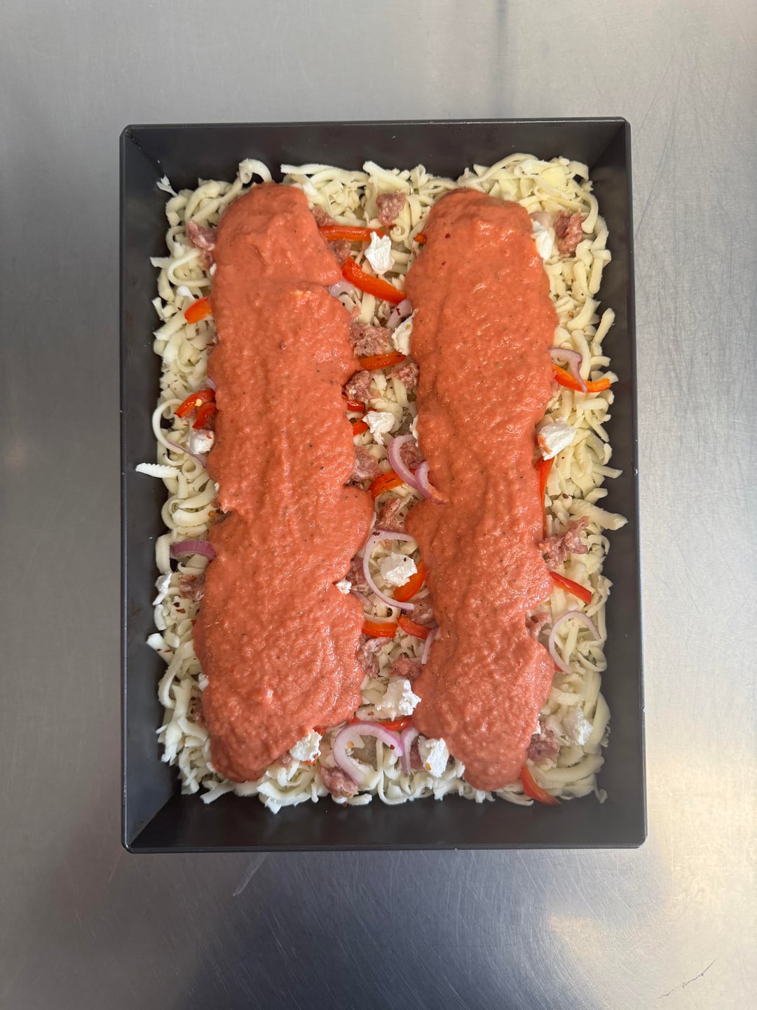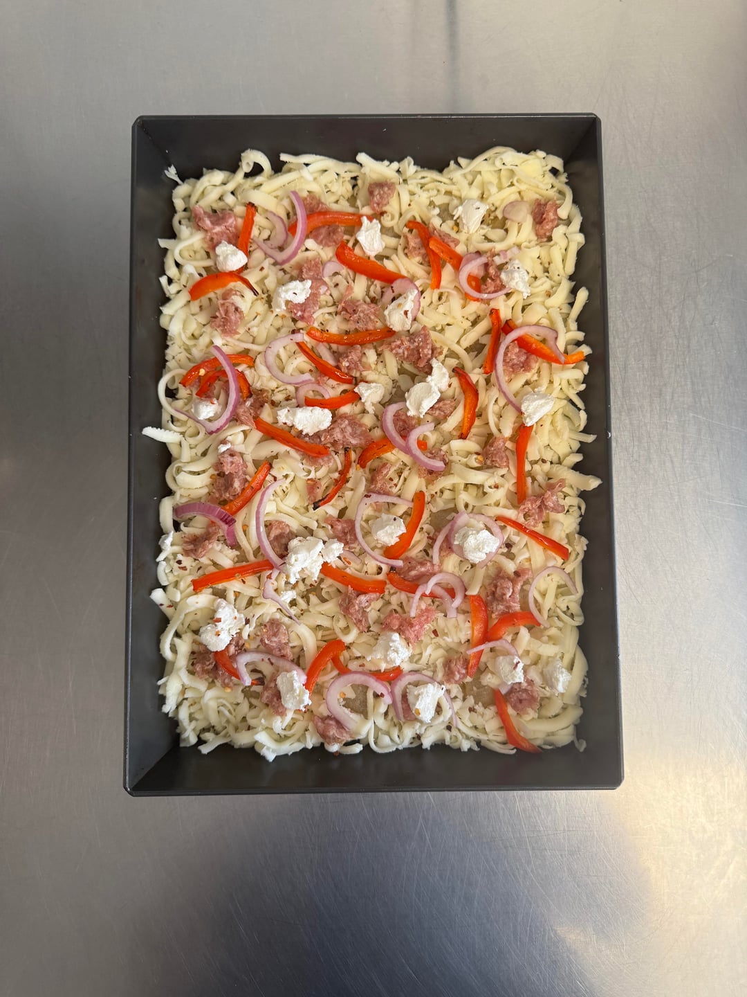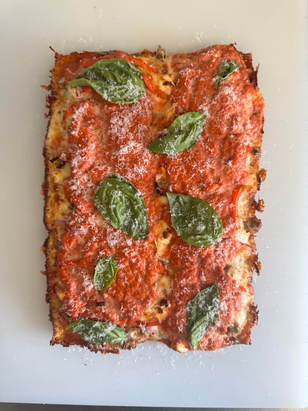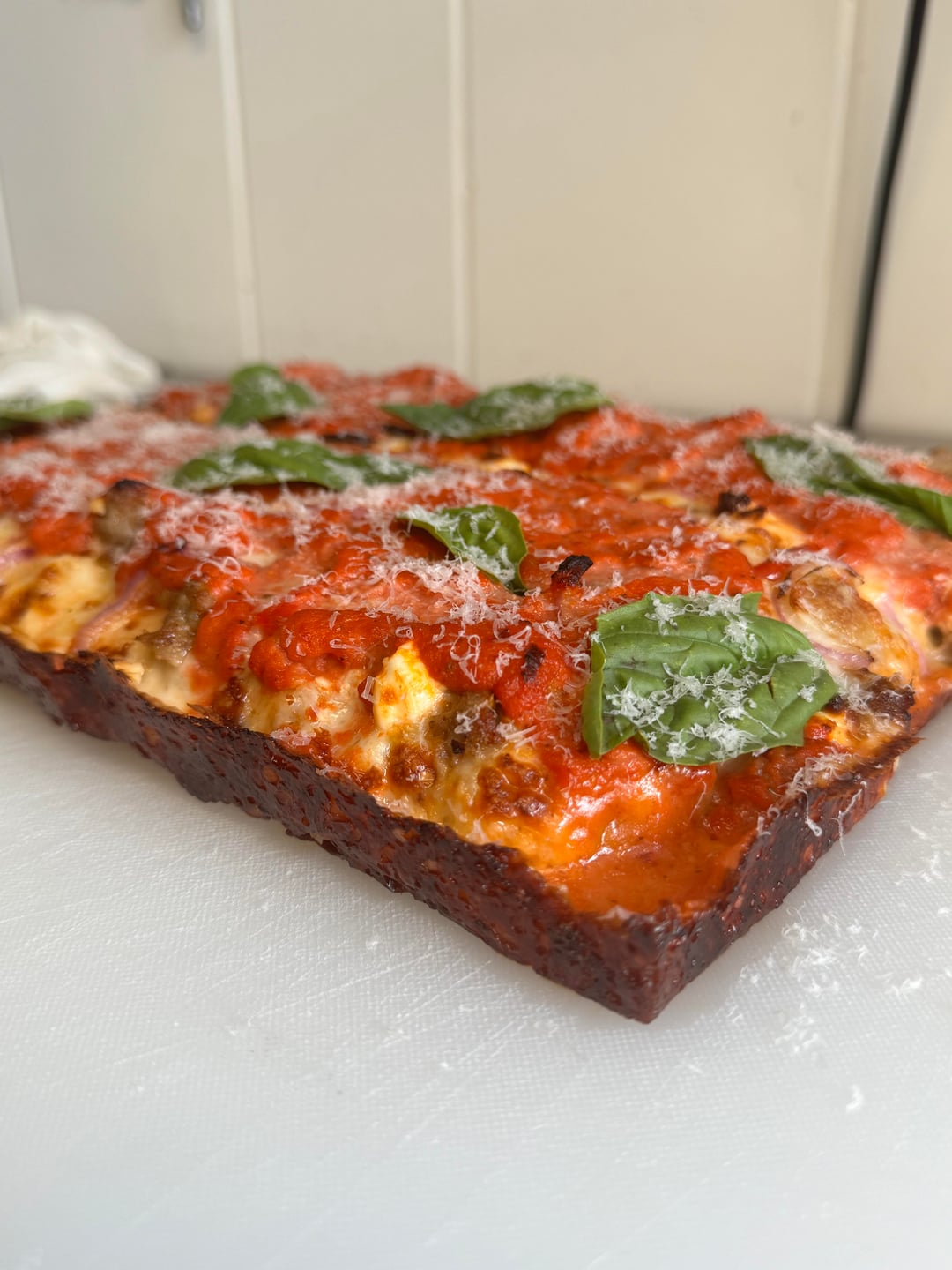 vodka sauce, house sausage, red onion, roasted red pepper, aged mozz, goat cheese, chilli flakes, basil, parm regg10×14 loyd pan600g dough ball73% 💦2.2% 🧂2% oilby DangerousSushi Looking for Feedbackpizza 2 Comments Exploring_wolf 9 hours ago Does it matter haw you call it since it was good? pmolsonmus 9 hours ago Par bake? Sicilian. Straight in the oven? Detroit. Per one of the “bibles”. Perfect Pan Pizza.Write A CommentYou must be logged in to post a comment.