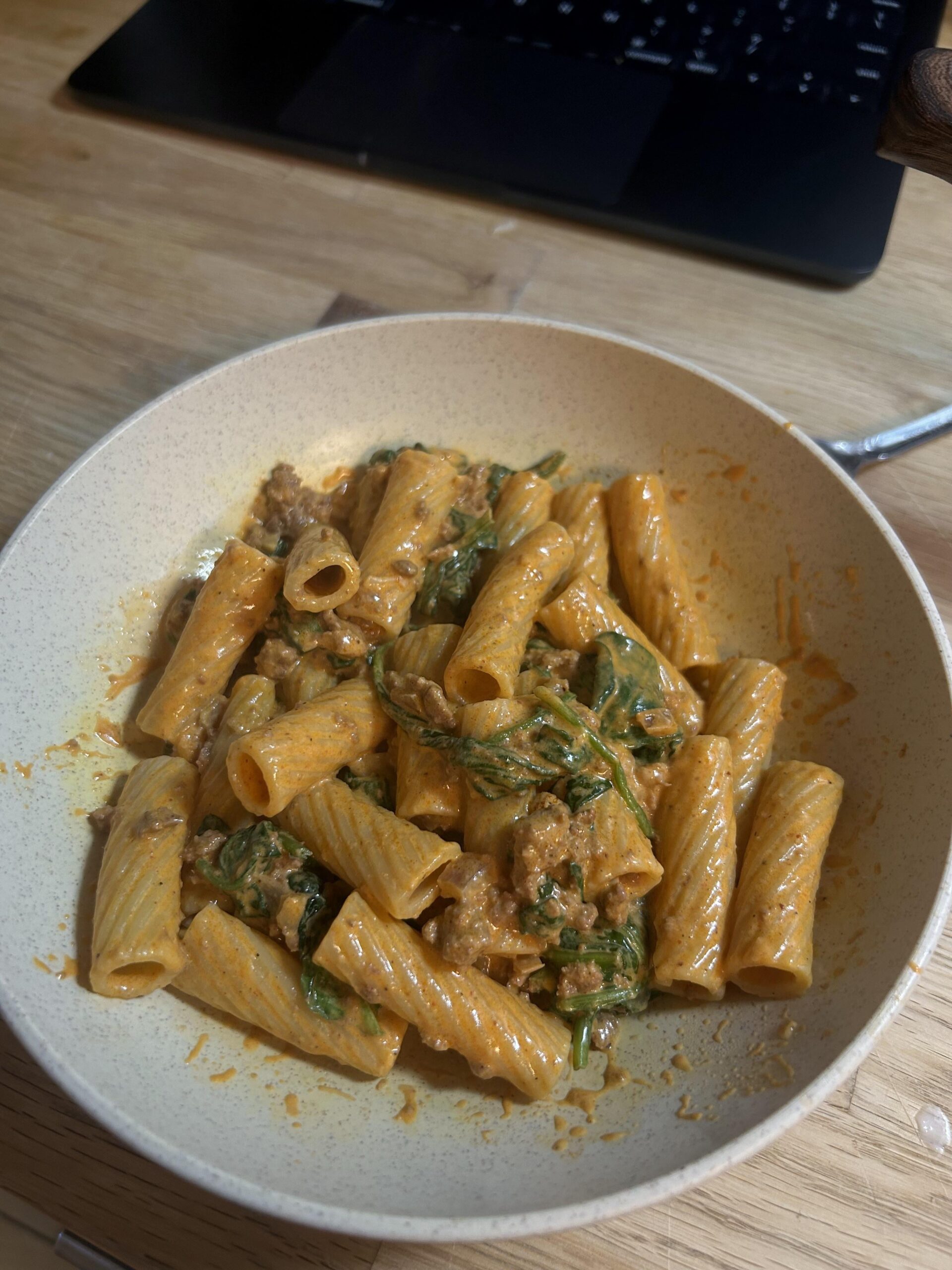 Simple dinner tonight- pasta puttanesca with sourdough bread and homemade red wine shallot compound butter