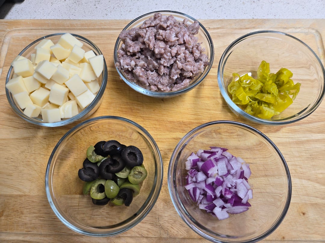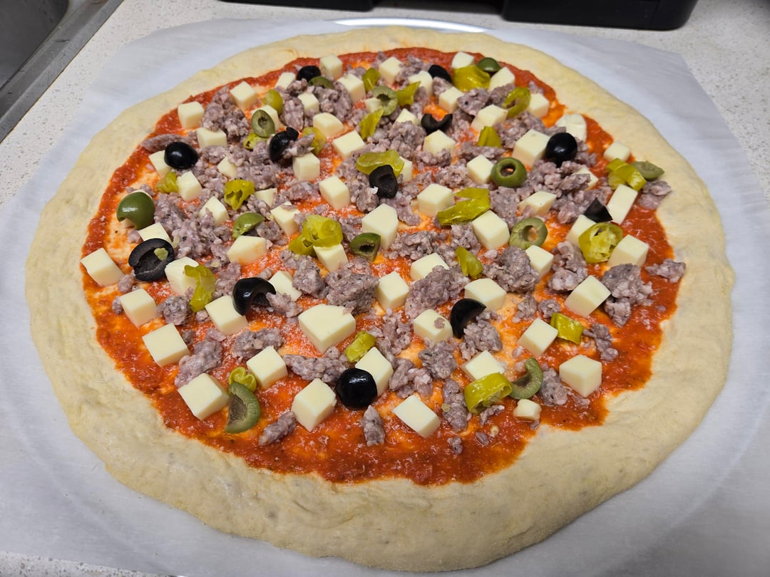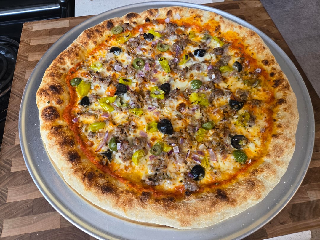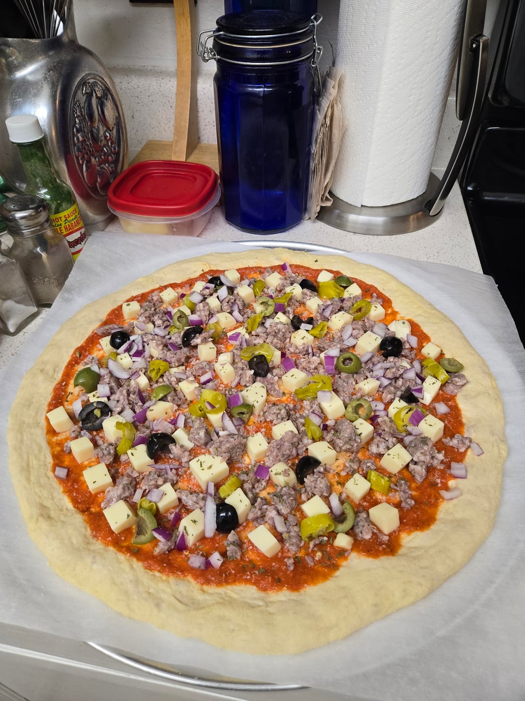 Sweet Italian sausage, pepperoncini, black olives, castelvetrano olives, red onion, (my own) tomato sauce, fresh grated Parmesan and cubed mozzarella!