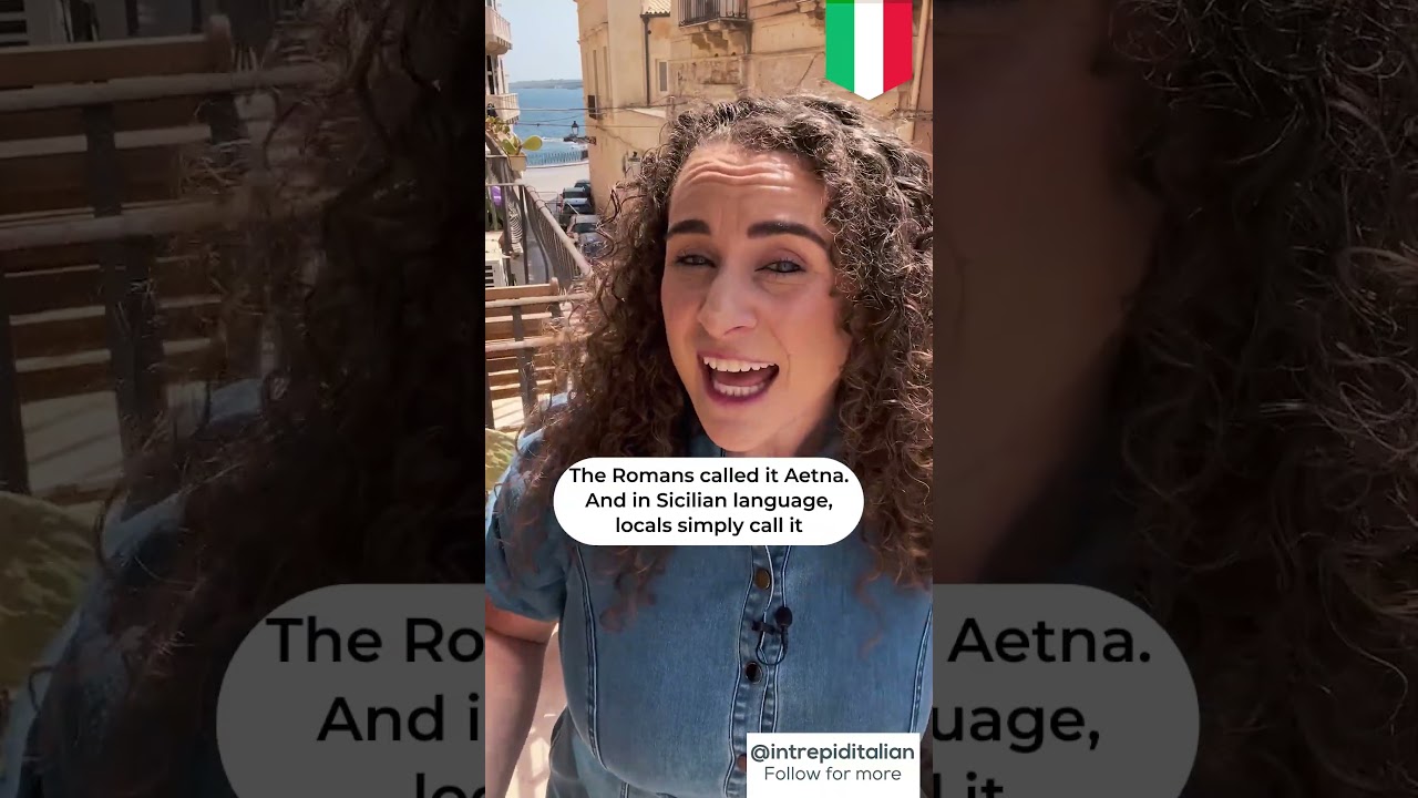 This is Mount Etna, rising over 3,300 metres high — that’s more than 10,900 feet! The name comes from the ancient Greek Aítnē, from aíthō — ‘to burn’ or ‘to shine.’ The Romans called it Aetna. And in Sicilian dialect, locals simply say ’a Muntagna — ‘the Mountain’ — because it dominates everything.”
