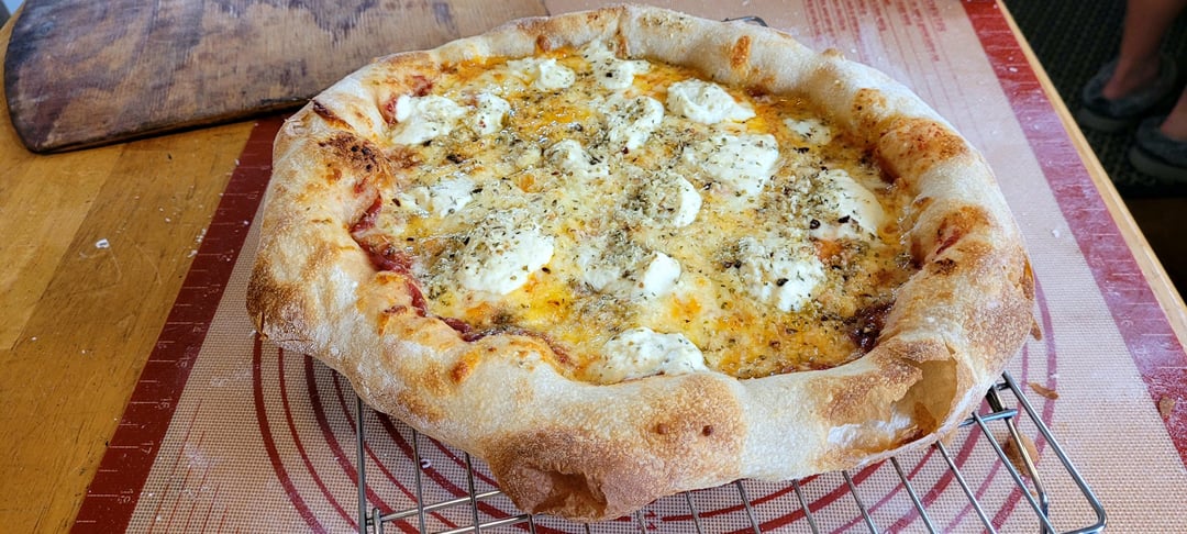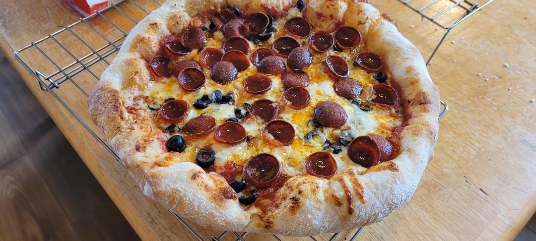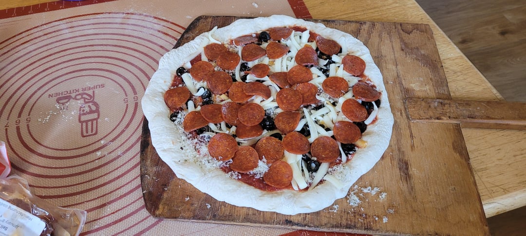 Spicy pepperoni (batistoni), black olives, mozzarella, and a bit of cheddar. Layered and finished with my pizza blend (Good parm, red pepper flakes, oregano, and a dash of salt)