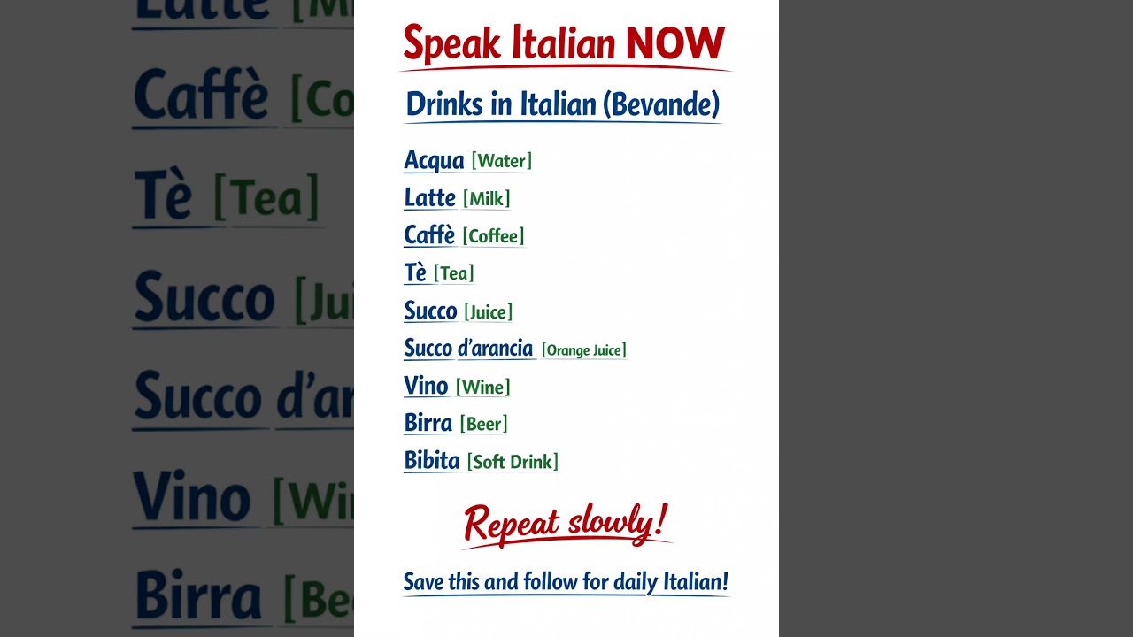 🌟 **Unlock the World of Italian Beverages! 🍹🇮🇹** Join us on an exciting journey through the vibrant and flavorful realm of Italian drinks! Whether you’re a fan of classic wines, refreshing cocktails, or delightful non-alcoholic options, this video has it all. From the enchanting notes of Chianti to the refreshing spark of Italian soda, get ready to discover your new favorite bevande! Click play and immerse yourself in Italy’s rich drink culture, learn key phrases in Italian, and impress your friends with your newfound drink knowledge! Don’t forget to like, subscribe, and comment on your favorite Italian drink below! Cheers! 🍷✨ #ItalianDrinks #Bevande #Italia #Wine #Cocktails #LearnItalian