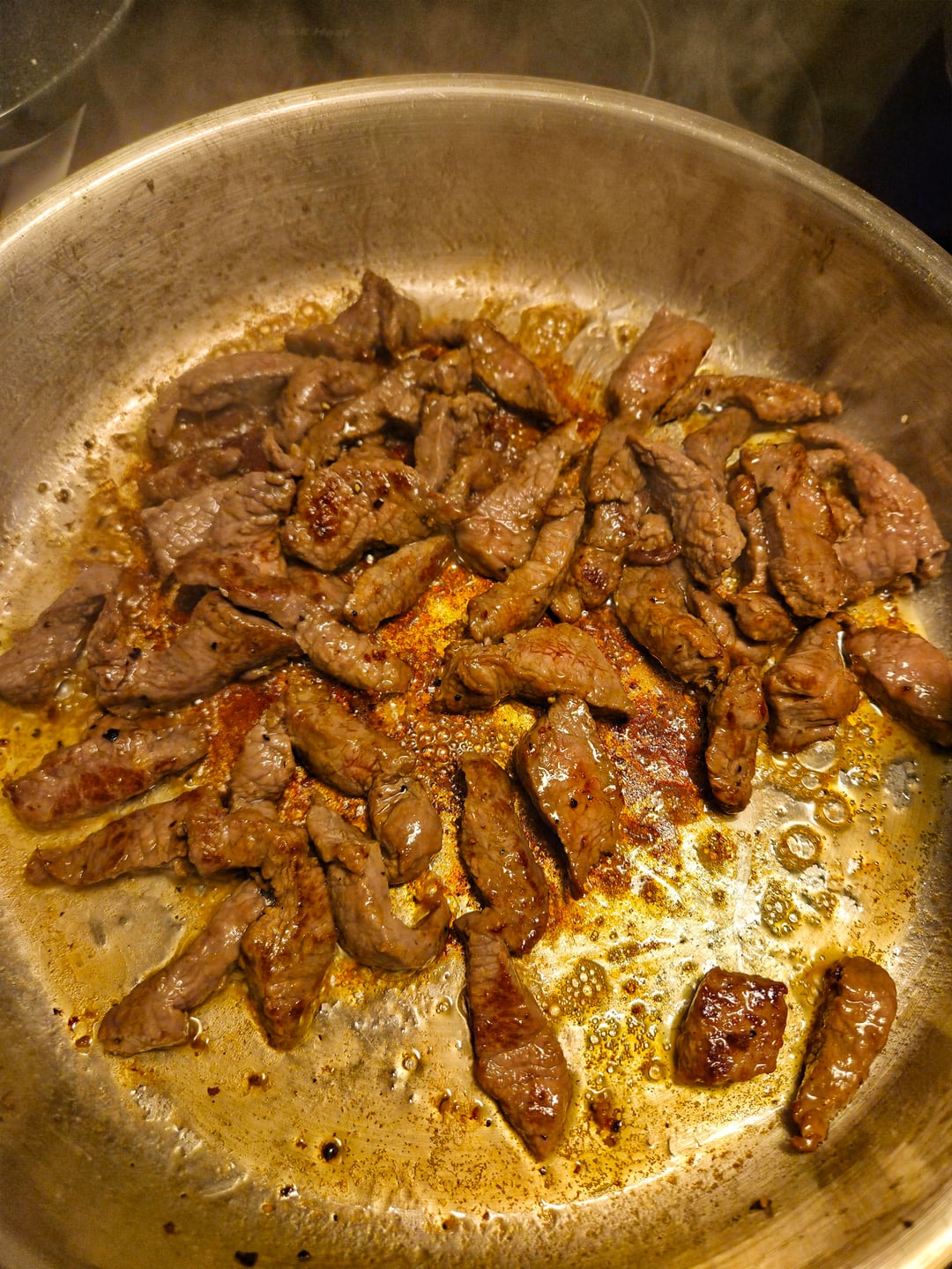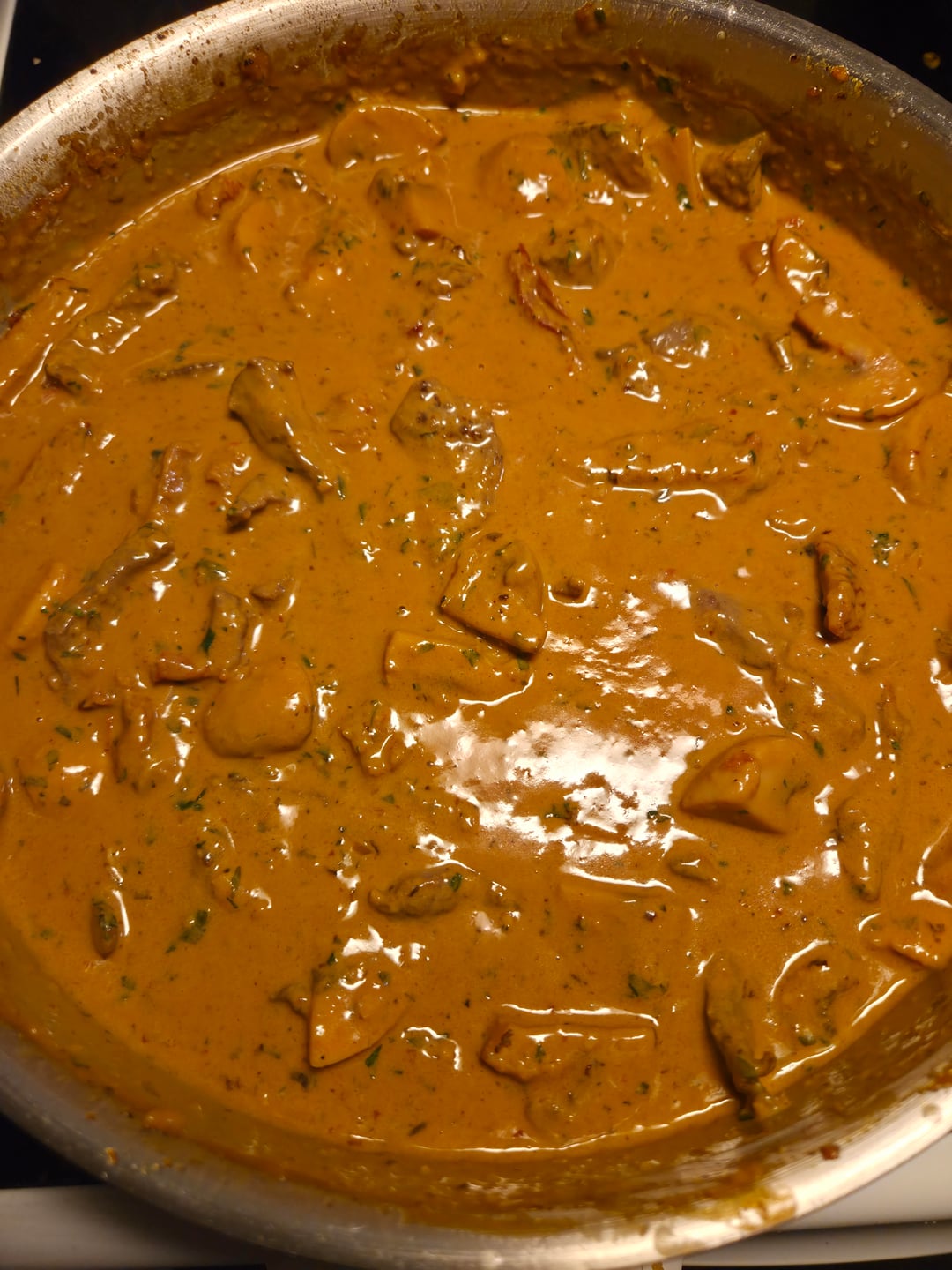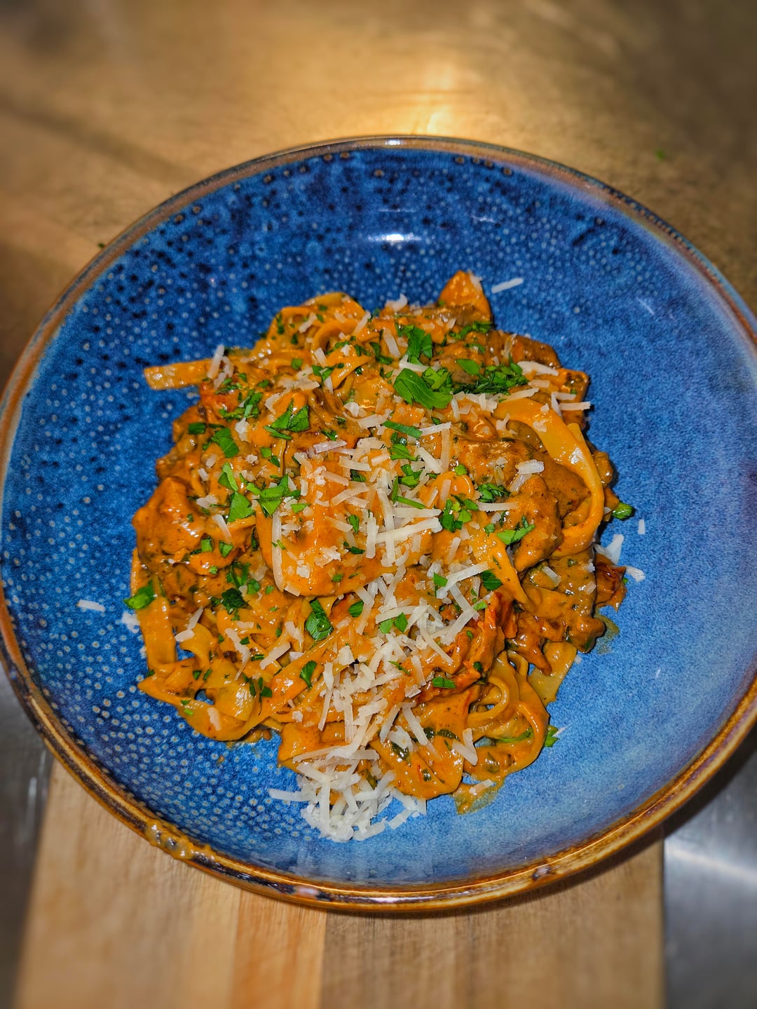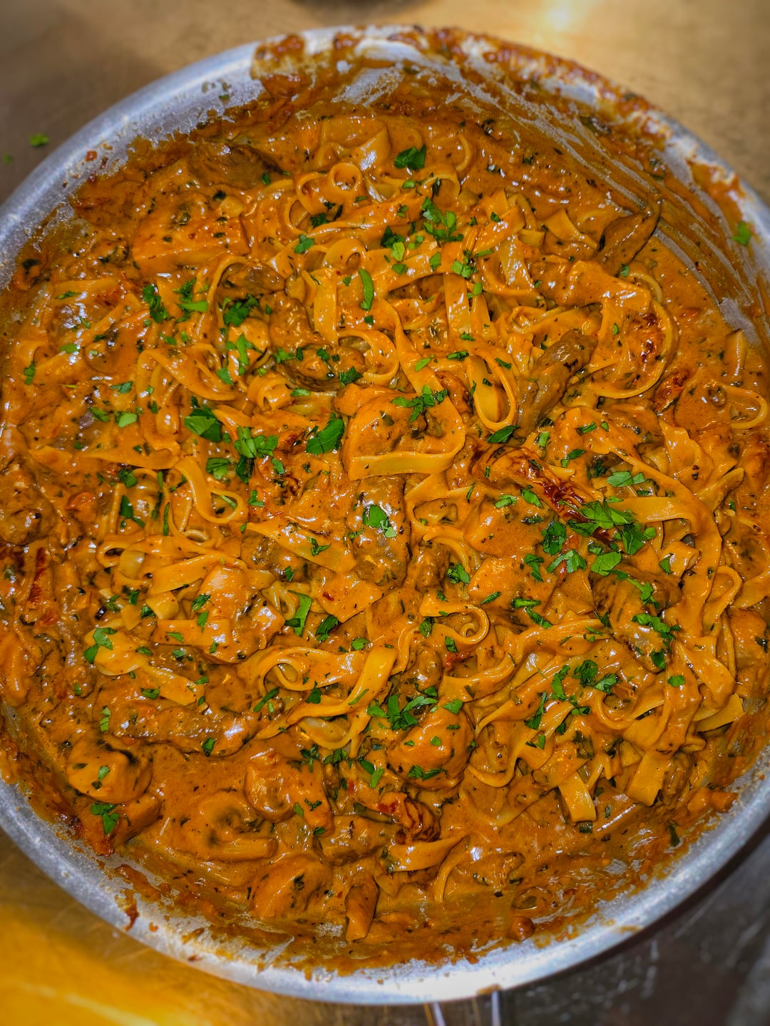 Pasta with shredded sirloin, garlic, onion, tomato paste, sun-dried tomatoes, white wine, cream, crème fraîche, veal stock, Dijon mustard, chili flakes, mushrooms, parsley, truffle oil, and parmesan