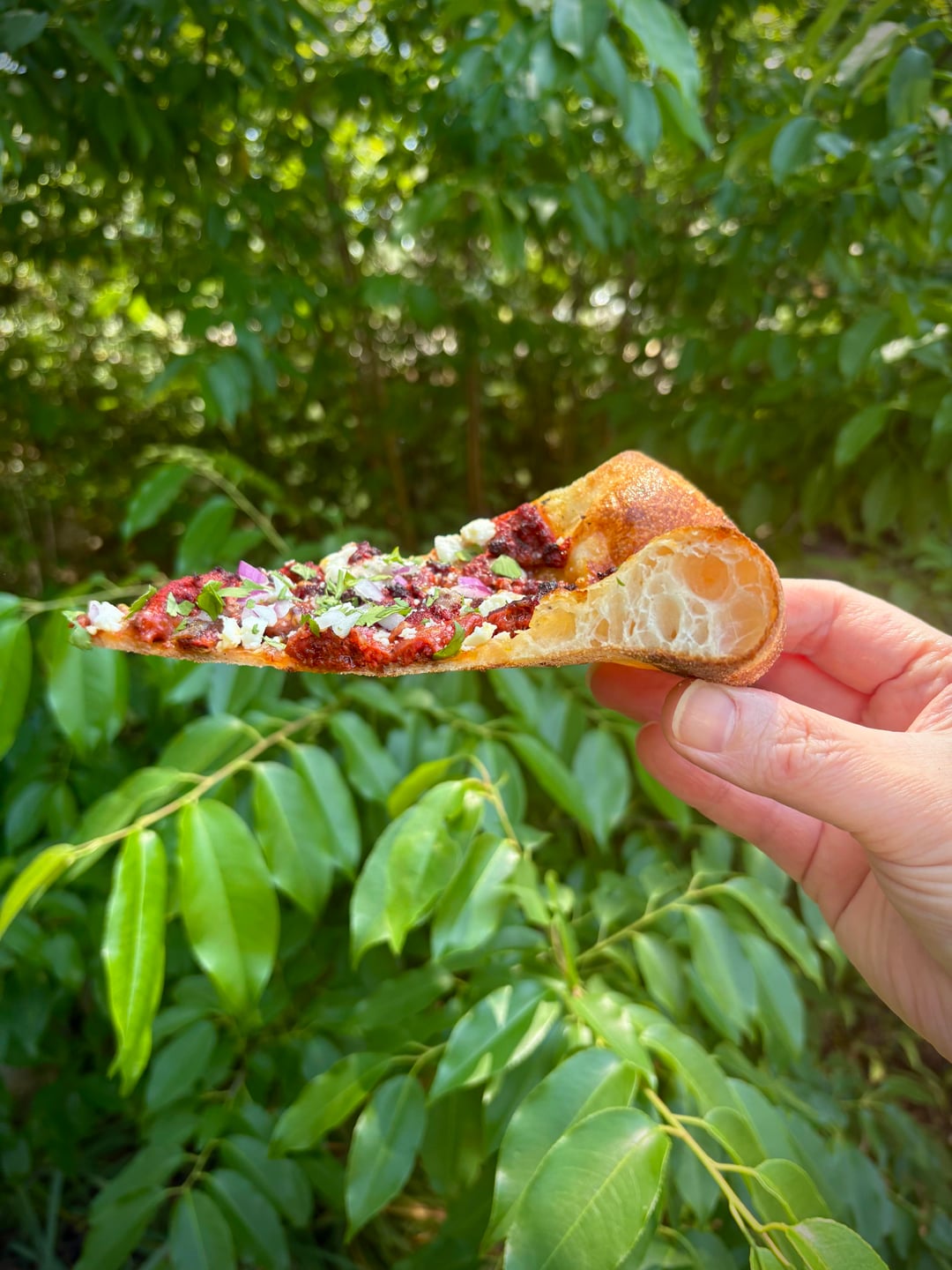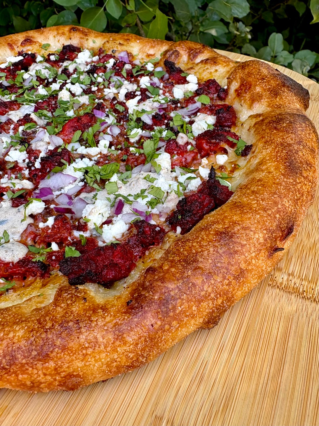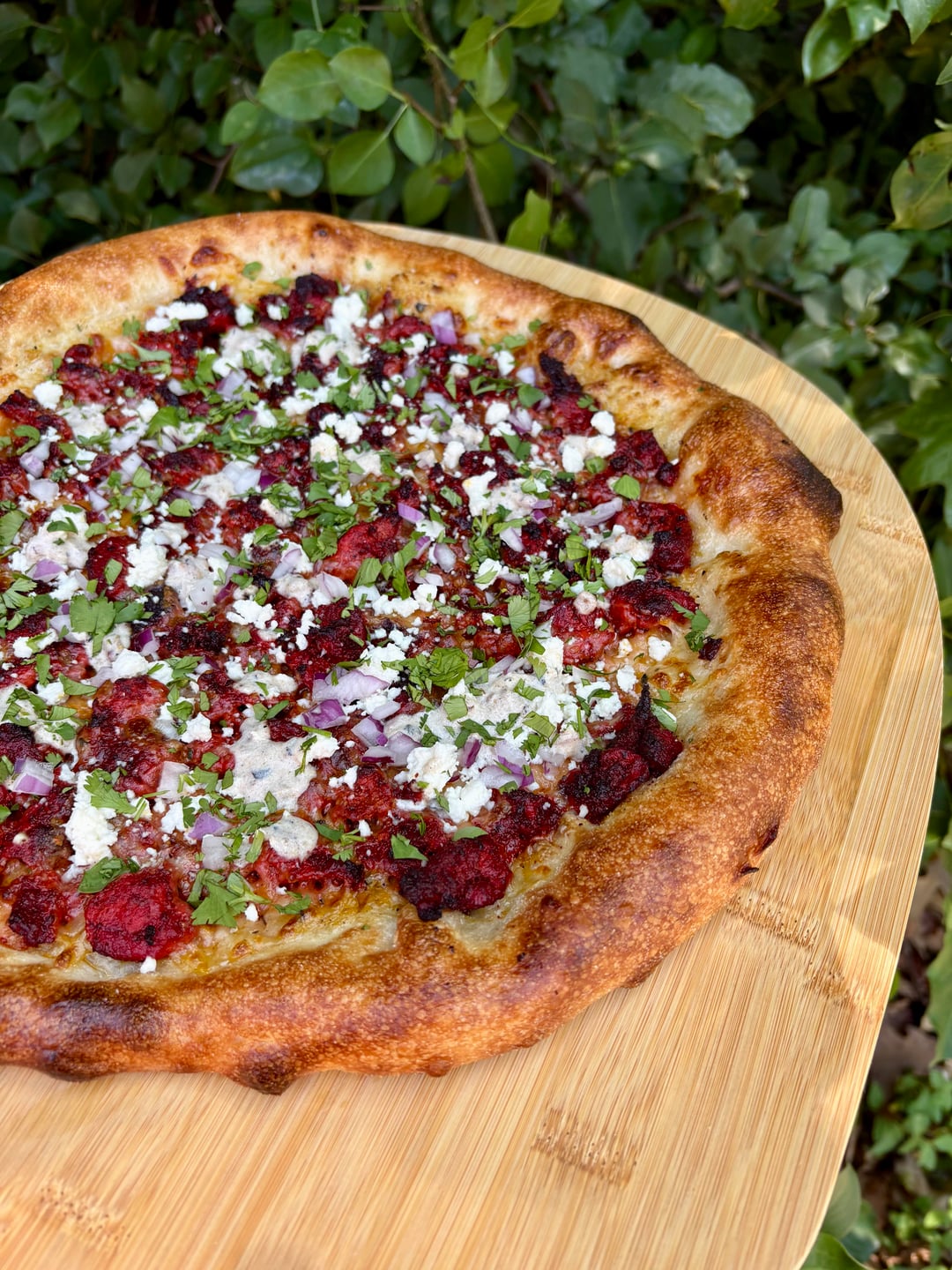 Crema/salsa verde base, mozzarella, al pastor. Finished with queso fresco, red onion, cilantro, and drizzled crema/salsa verde.