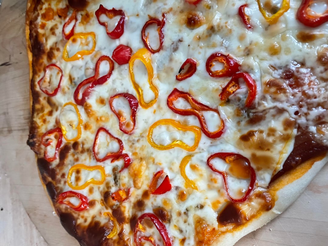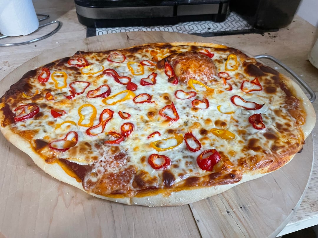 I used a refrigerated Portland Pie Co. Neapolitan dough lump from the grocery store deli. Cooked in my kitchen oven, which is propane. Also includes sliced mozzarella from the deli, Trader Joe’s pizza sauce, and dried basil and oregano from last year’s garden. 😋