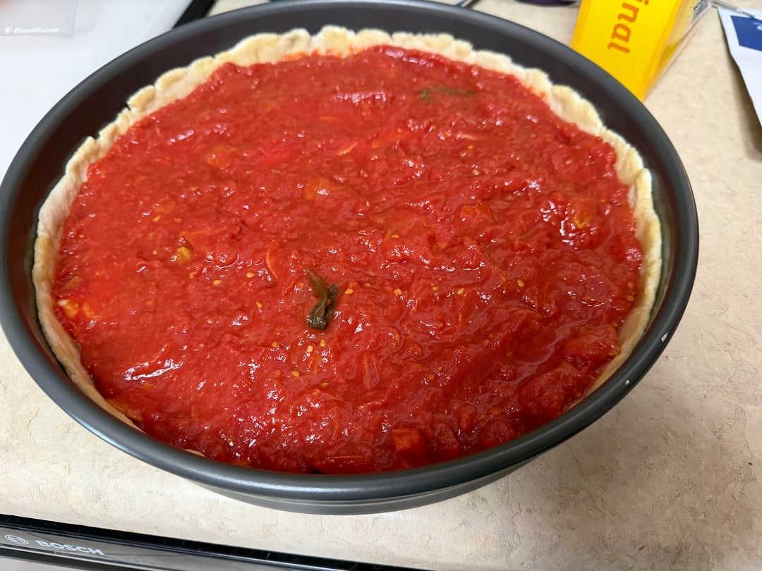 Here it is, my second attempt at deep dish! I used the dough recipe from The Real Deep Dish site. This was a lot better than my first attempt with Brian Lagerstrom’s recipe. His was too “bready”. This was a much better texture. I used a mix of canned Bianco Di Napoli whole peeled with basil and Bianco crushed. I drained both cans of excess water and hand crushed the whole peeled tomatoes. I did add some decent salt to them.