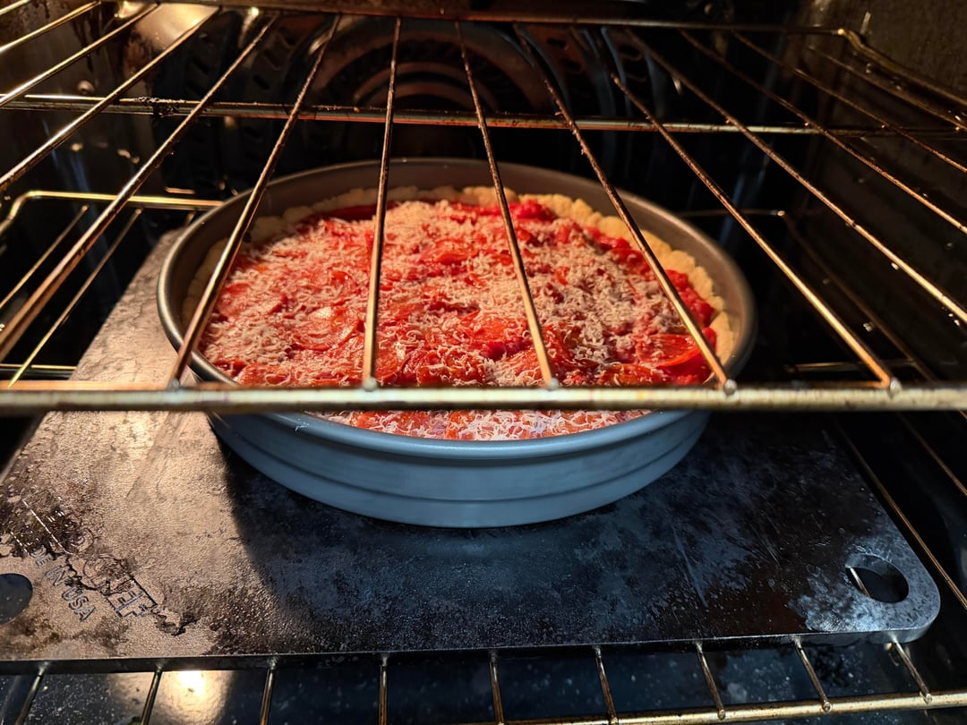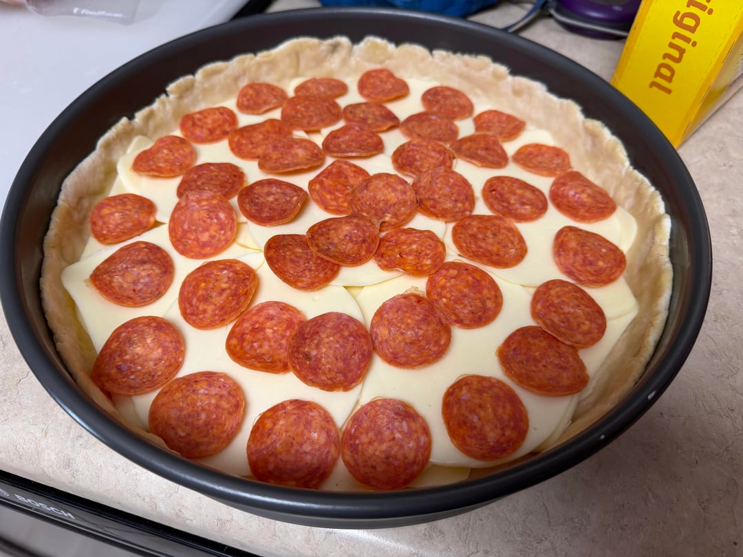 I used a full pound of sliced Boar’s Head whole milk low moisture mozz followed by about 5 slices of provolone. Then a layer of Rosa Grande pepperoni. Topped with sauce. Then another layer of peps on top. Shaved some parm cheese on top.