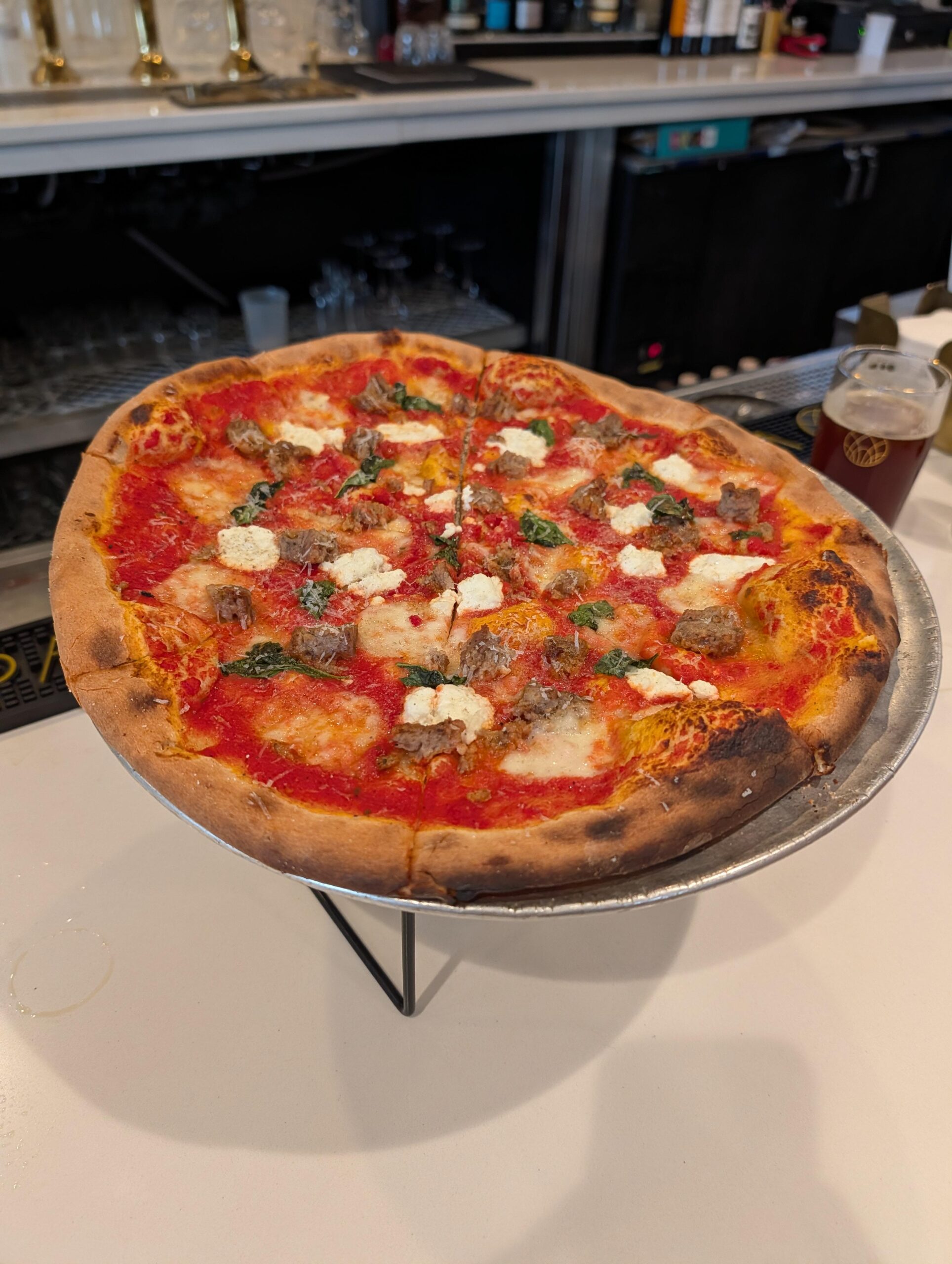It's called "The Real G" on their menu. Neapolitan style, lasagna inspired pie with fresh mozzarella, ricotta, red sauce, garlic oil, Fischer Farm's Italian sausage, fresh basil and Grana Padano. Honestly I would have liked a bit more cheese on it but it was delicious nonetheless.