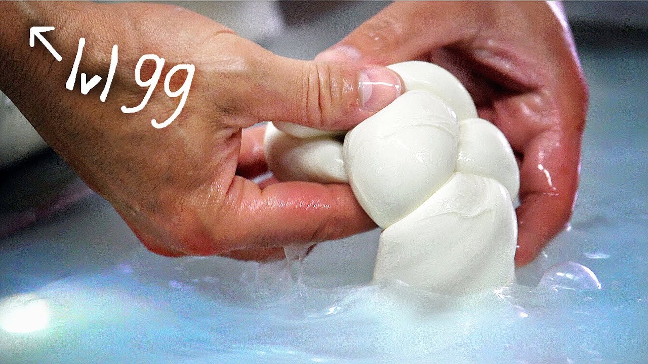 Artisans curdle the milk by introducing natural whey from previous batch. Curds are matured and acidified naturally. Then Spinning “Pasta filata”…