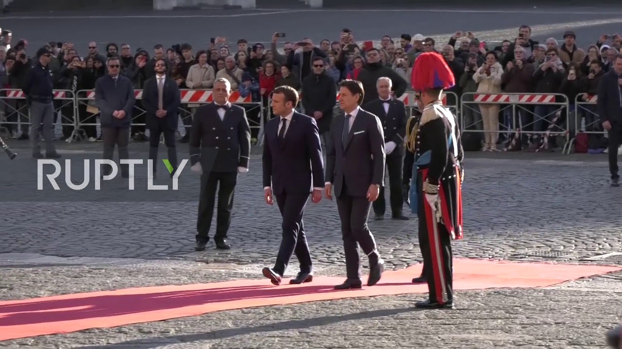 The head of the Elysee was seen shaking hands with PM Conte as a band of Carabinieri, national gendarmerie of Italy, flanked the red carpet that would lead the personalities towards the Palace Chigi.