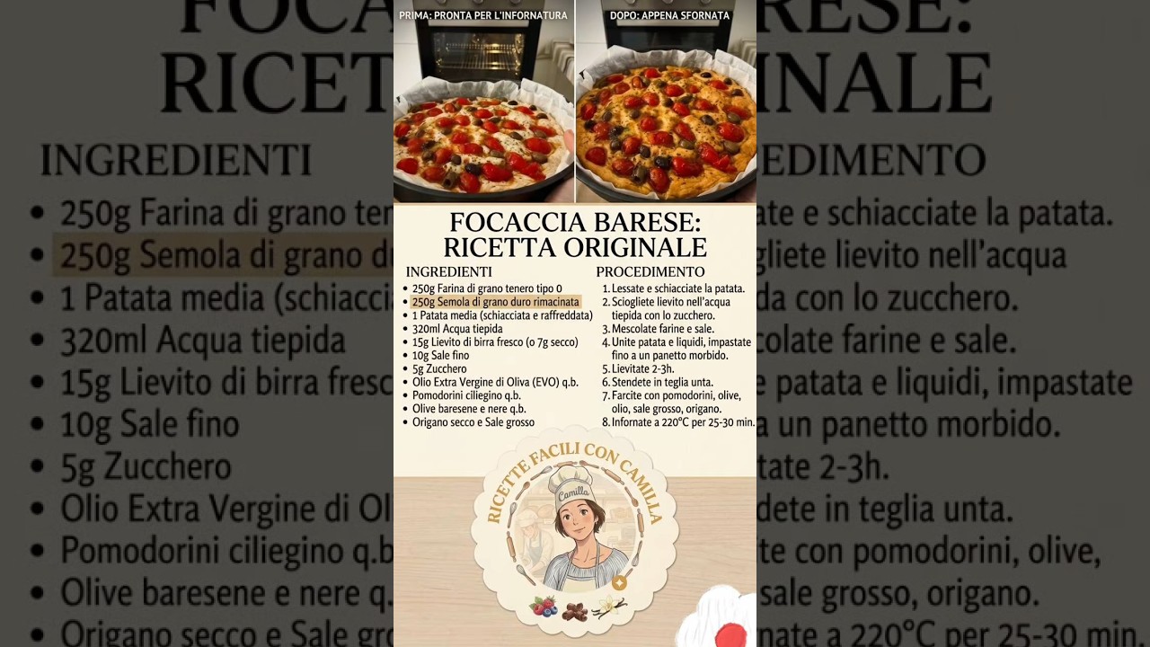 Welcome back to “Ricette facili con Camilla”! Today we are making the famous Focaccia Barese from Puglia. This recipe uses a secret ingredient—a boiled potato—to make the dough incredibly soft on the inside while staying crunchy on the outside.