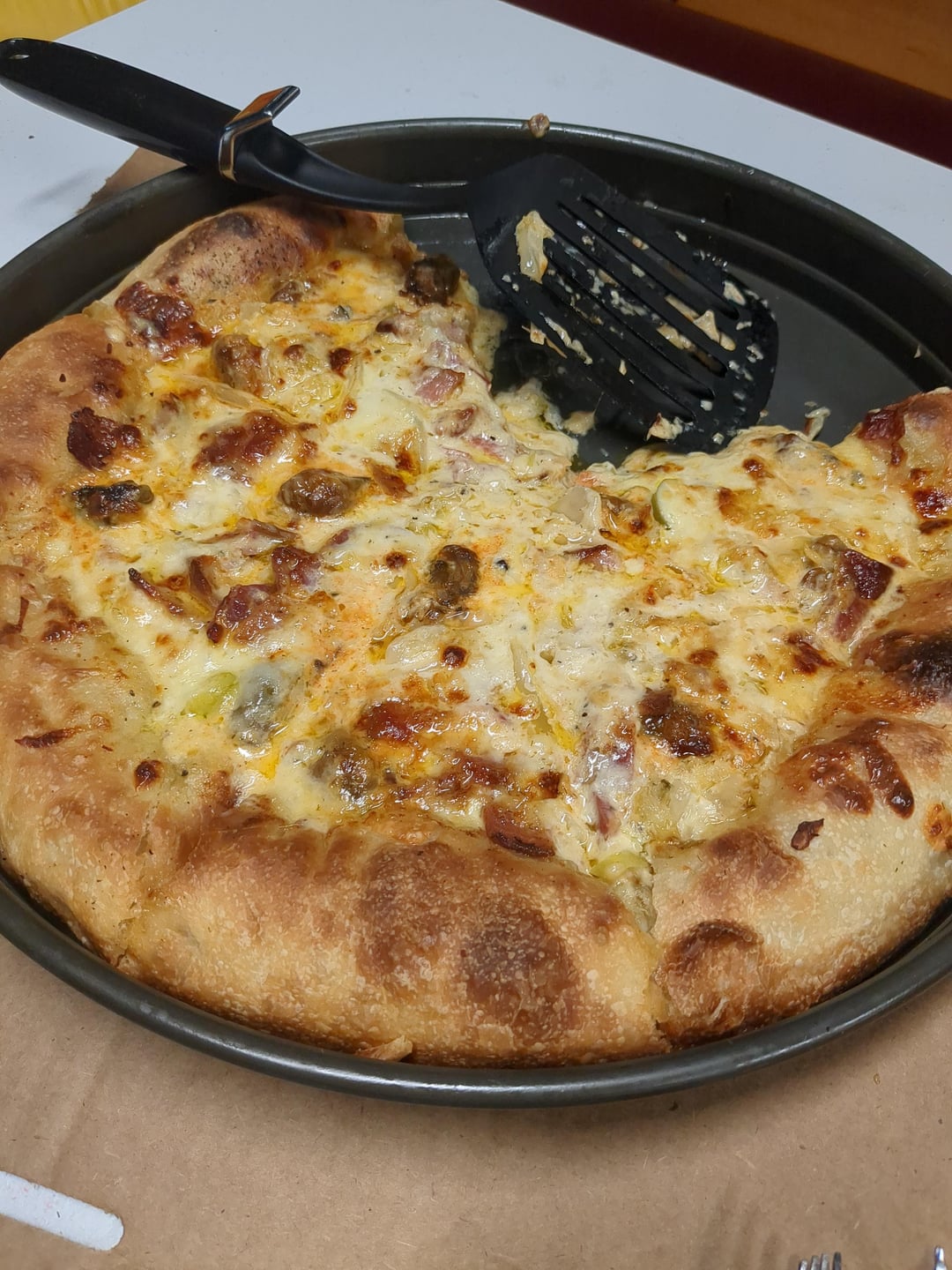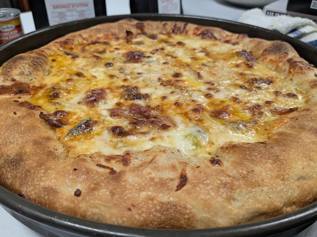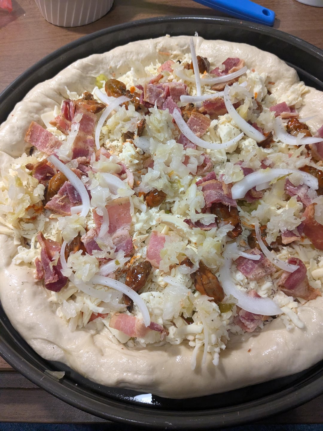 Bacon and mozzarella stuffed crust, Dijon Alfredo base, smoked cheddar, Swiss and mozzarella blend, smoked oysters, bacon, onions, Pepperoncini, tomatoes and sauerkraut.The verdict: surprisingly good. But overwhelmingly messyby EdwardBloon Looking for Feedbackpizza 1 Comment Particular_Copy_666 4 hours ago You’re not even going to show the stuffed crust?Write A CommentYou must be logged in to post a comment.