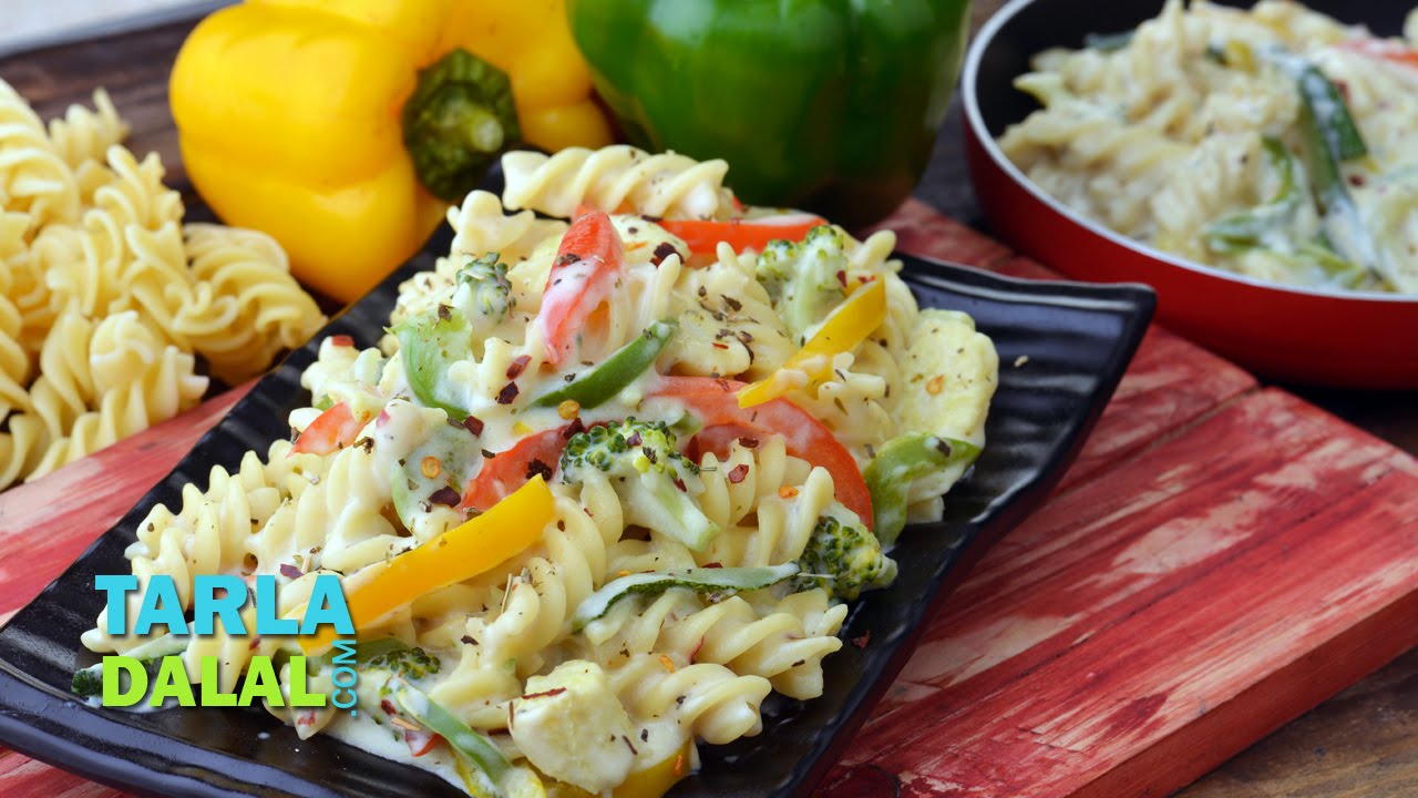 Pasta in White Sauce, a colourful pasta treat which is sure to be loved by kids as well as adults!