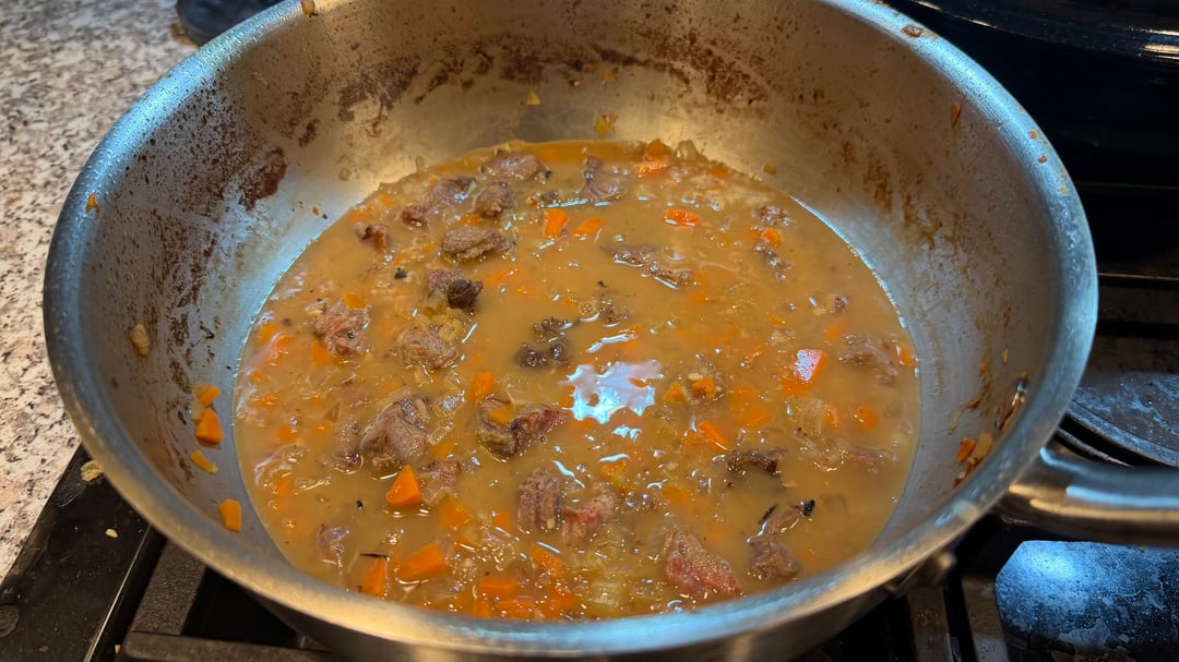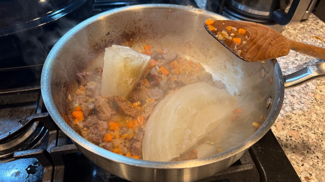 I marinaded the trimmed cheeks from my guanciale jowl in soy sauce, rice wine vinegar, brown sugar, minced garlic, and red pepper flake. Seared both cheeks on medium heat until well browned on both sides, then sliced into bite sized pieces. Cooked the mirepoix in the fond, deglazed with a splash of white wine, added back the cheeks and then simmered in my own homemade chicken stock for 2.5 hours. Separated the jus from the mixture, combined with the pasta, then drizzled the jus on top with fresh grated parmesan.
